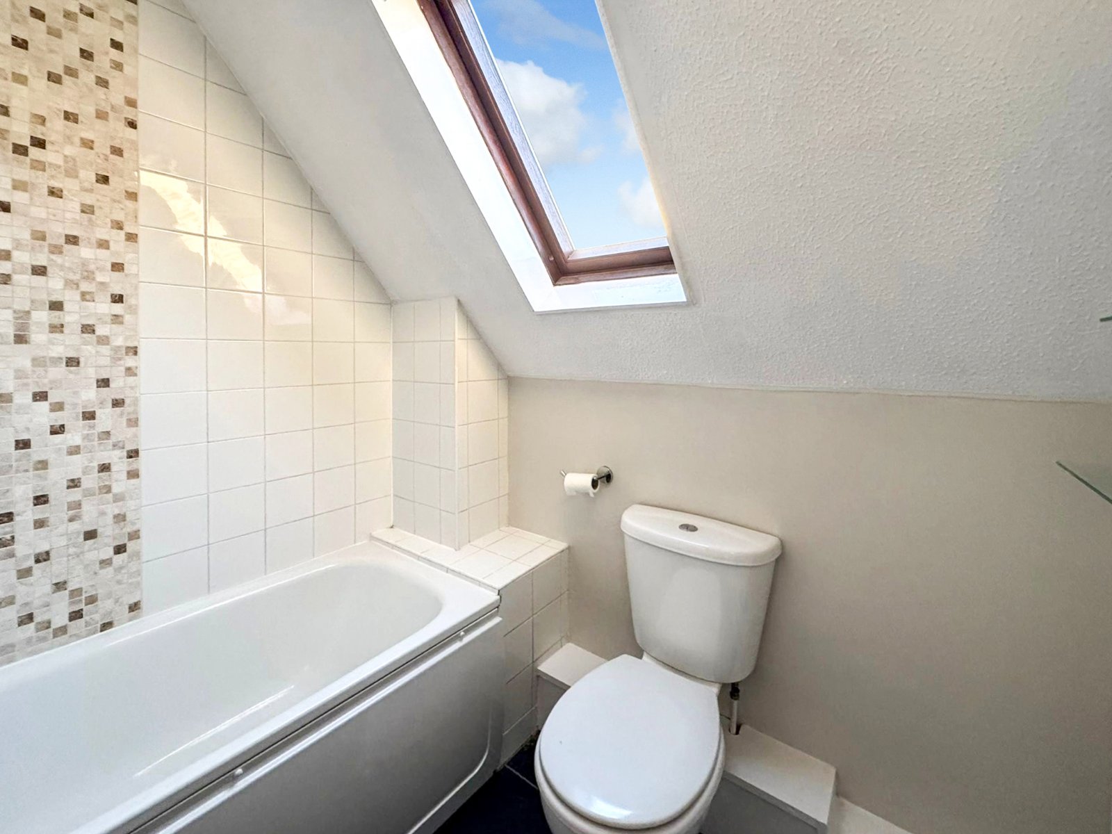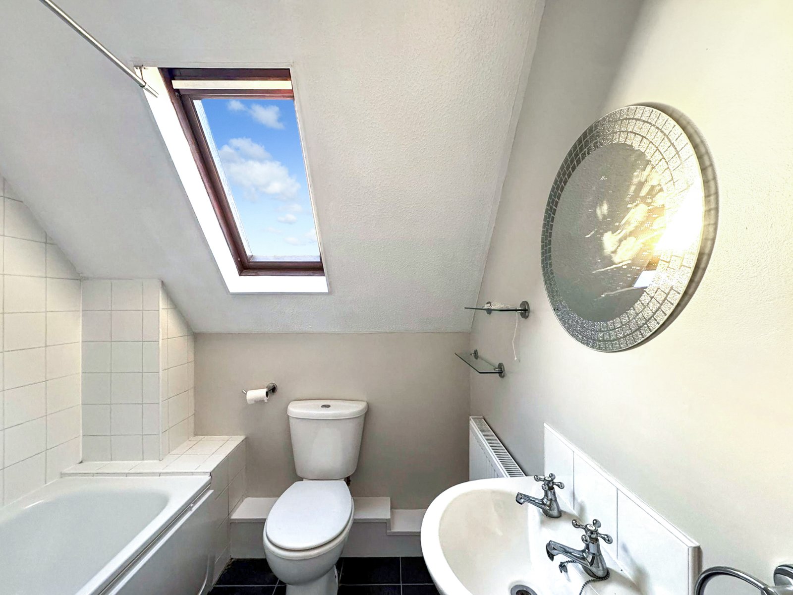 (some restricted head height) Obscure double glazed skylight window to rear aspect. The white three piece suite comprises panelled enclosed bath with wall mounted electric shower over, dual flush WC and pedestal wash hand basin. Radiator. Partly tiled walls. Textured ceiling.