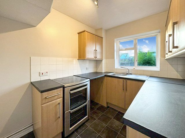 Double glazed window to rear aspect. The Kitchen is fitted with a range of eye and base level units with rolled edge working surfaces over inset with stainless steel single drainer sink unit with mixer tap over. Splashback tiling. Under counter recess housing washing machine (to remain). Freestanding oven (to remain). Upright fridge/freezer (to remain). Laminate wood effect flooring. Radiator. Textured ceiling.