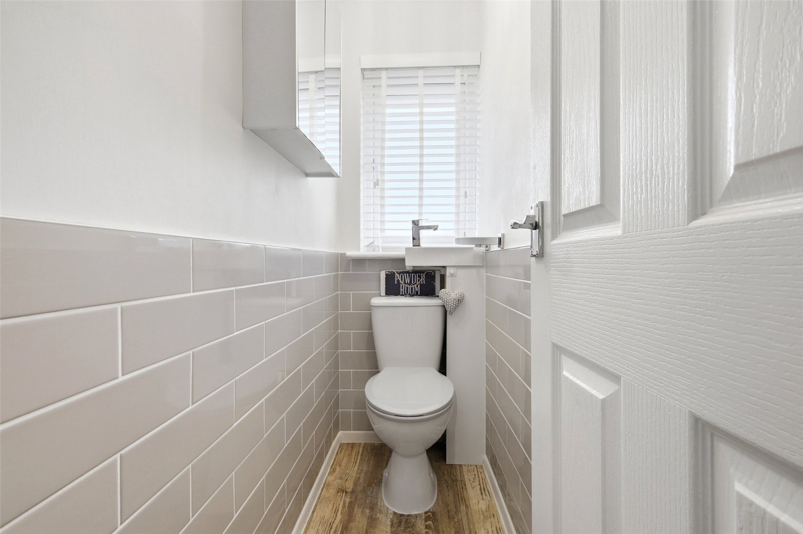 Obscure uPVC double-glazed window to front. Fitted with a two piece suite comprising dual flush close coupled WC and over cistern basin with designer mixer tap. Metro tiling to half height with feature bordered edging. Oak effect flooring.