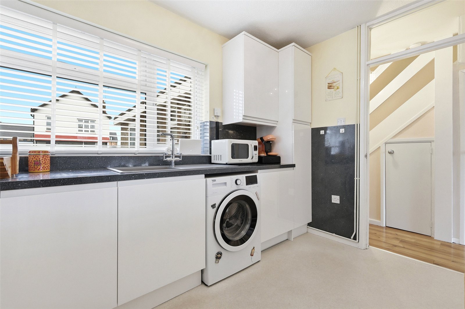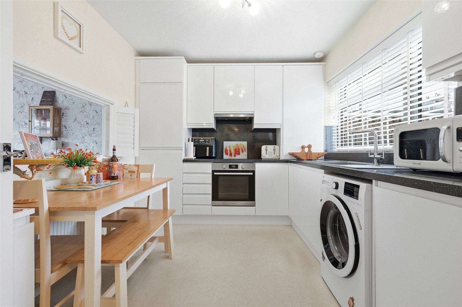 uPVC double glazed window to front. The kitchen has been professionally planned and fitted with a comprehensive range of base, eyelevel and full height gloss fronted frameless cabinets with squared-edged granite effect working surfaces and inset polycarbonate sink unit with designer mixer tap. The range of integrated appliances includes split level fan assisted electric oven with four ring induction hob, designer extractor canopy, fridge, freezer and dishwasher. Matching upstands and splashbacks to all working surface areas. Radiator. Ample space for refectory table.