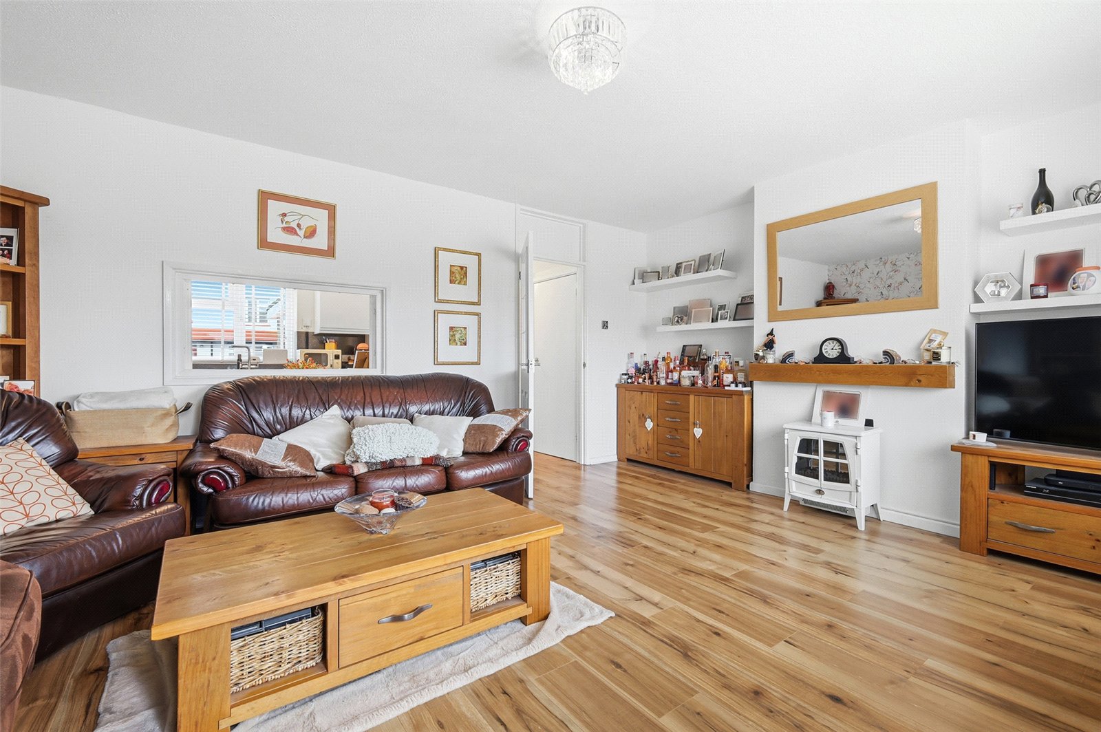 uPVC double glazed door giving access to the landscaped rear garden, and uPVC double glazed window overlooking the landscaped rear garden. Oak effect flooring. Radiator. Open fireplace with oak mantel. Television aerial point. Servery from kitchen with bespoke Plantation shutters.