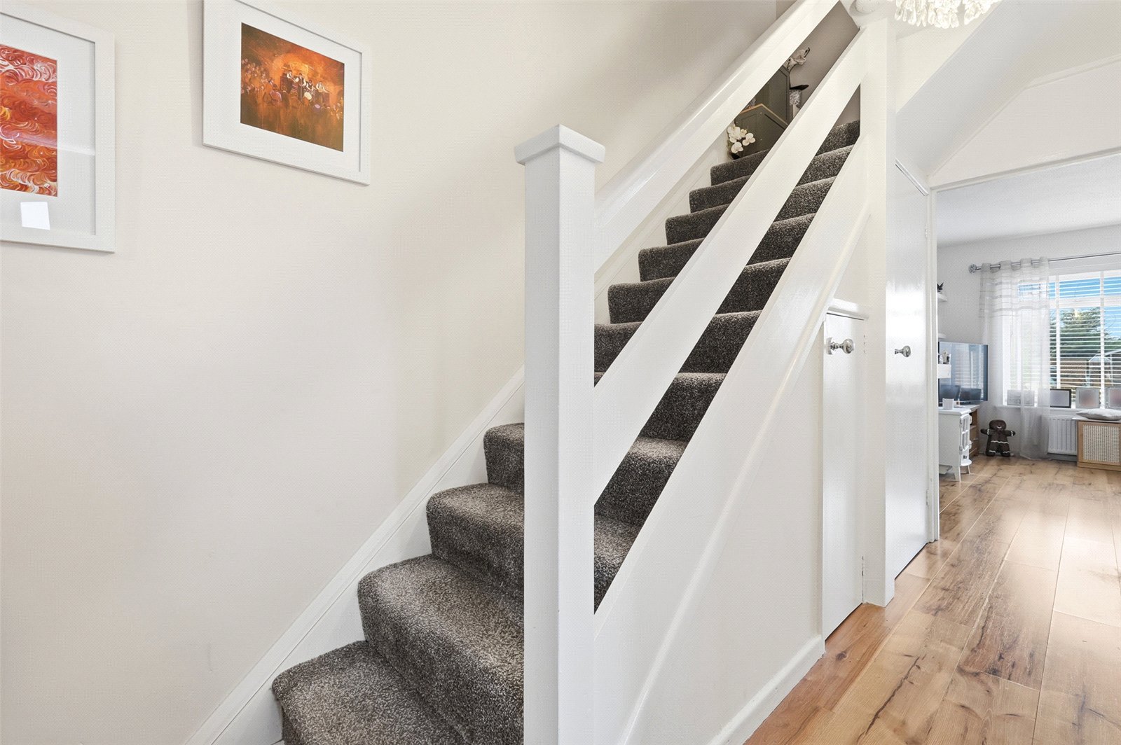 Oak effect flooring. Radiator. Access to understairs storage cupboard. Staircase to first floor landing. Access to utility store. Etched glazed Shaker style doors lead off to principal rooms, and a four panel door gives access to:
