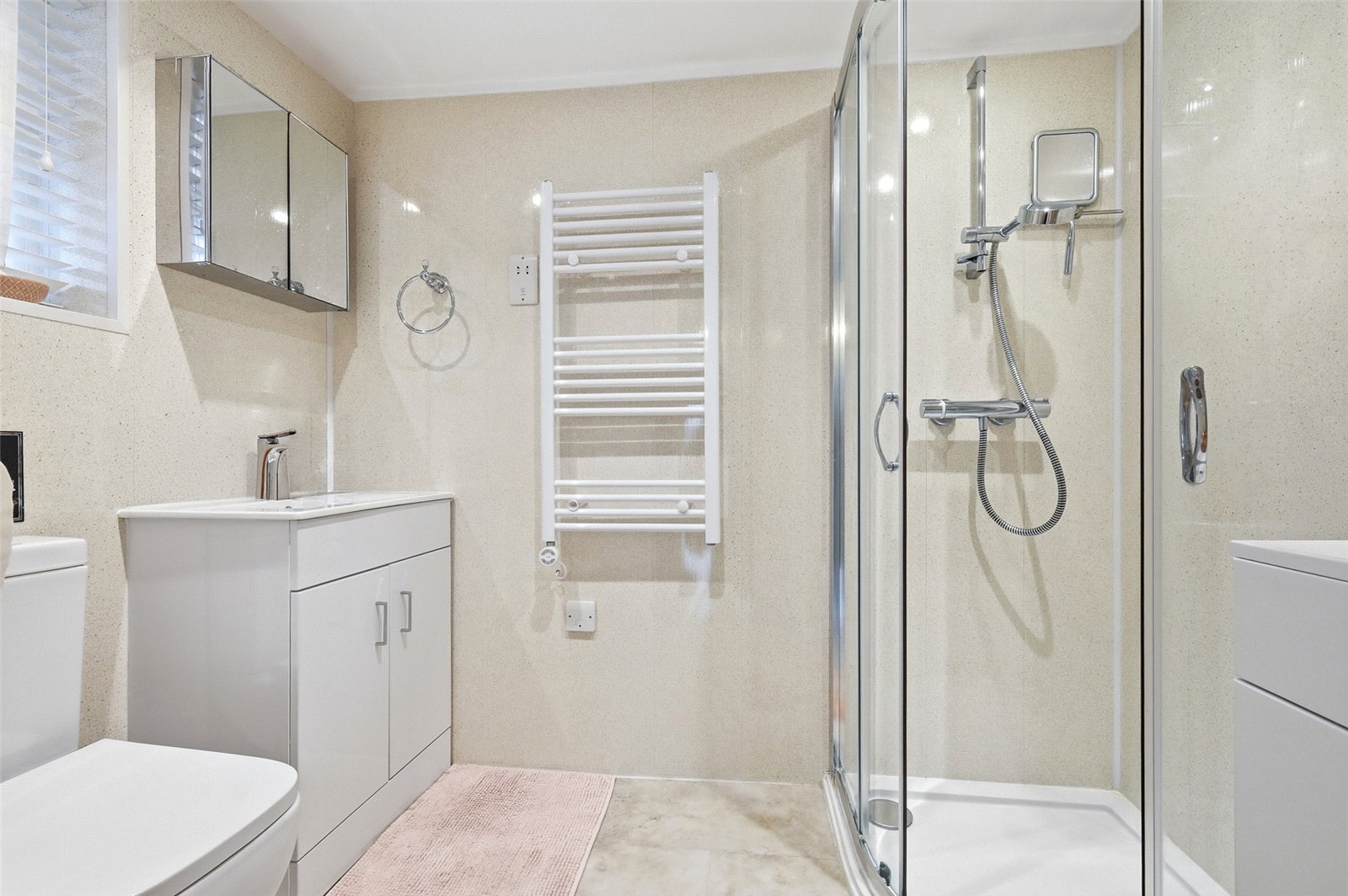 Obscure uPVC double glazed window to side. Vinyl tiled flooring. Marbonyx panelling to all walls. Fitted with a three piece contemporary suite comprising offset quadrant shower enclosure with inset 'Mira' electric shower, dual flush close coupled WC, and vanity wash basin with designer mixer tap and gloss fronted storage cabinet beneath. Electric shaver point. Electric heated towel rail. Smooth plastered ceiling with recessed LED lighting.