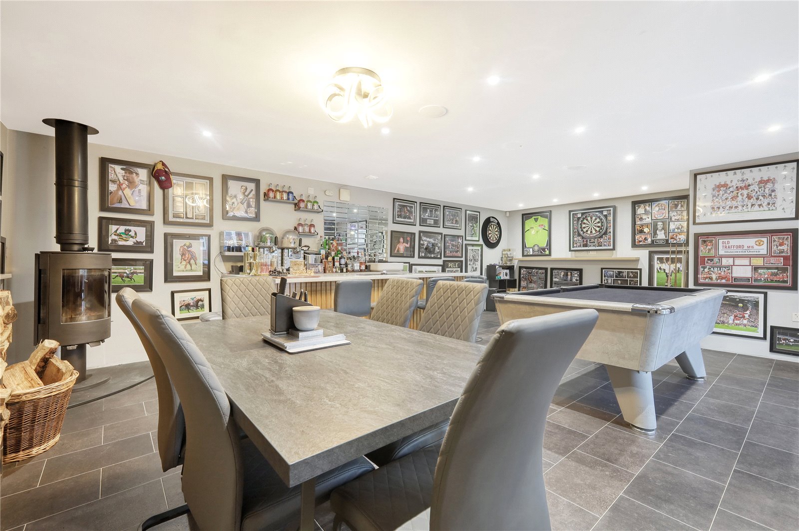 A substantial bespoke garden lodge with attractive composite clad exterior and double glazed bi-folding doors leading onto the pool terrace with veranda style overhang (with recessed LED lighting). Internally, the lodge has a luxury vinyl tiled floor with bespoke contemporary bar unit under quartz surfaces with mirrored metro tiled feature above. Corner cast iron log burner with flue, integrated wiring for flat screen TV