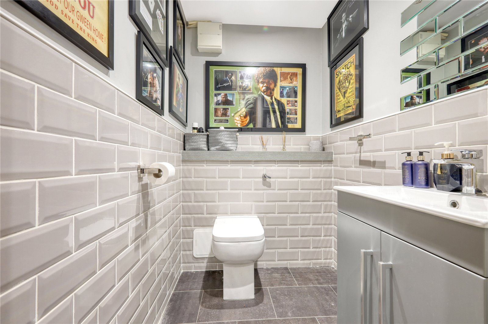 Obscure double glazed coloured lead lite window to front. Lipped skirting. Radiator. Suspended wash hand basin with tiled splashback and close coupled w.c. Trip switch box. Coved cornice to smooth plaster ceiling.
