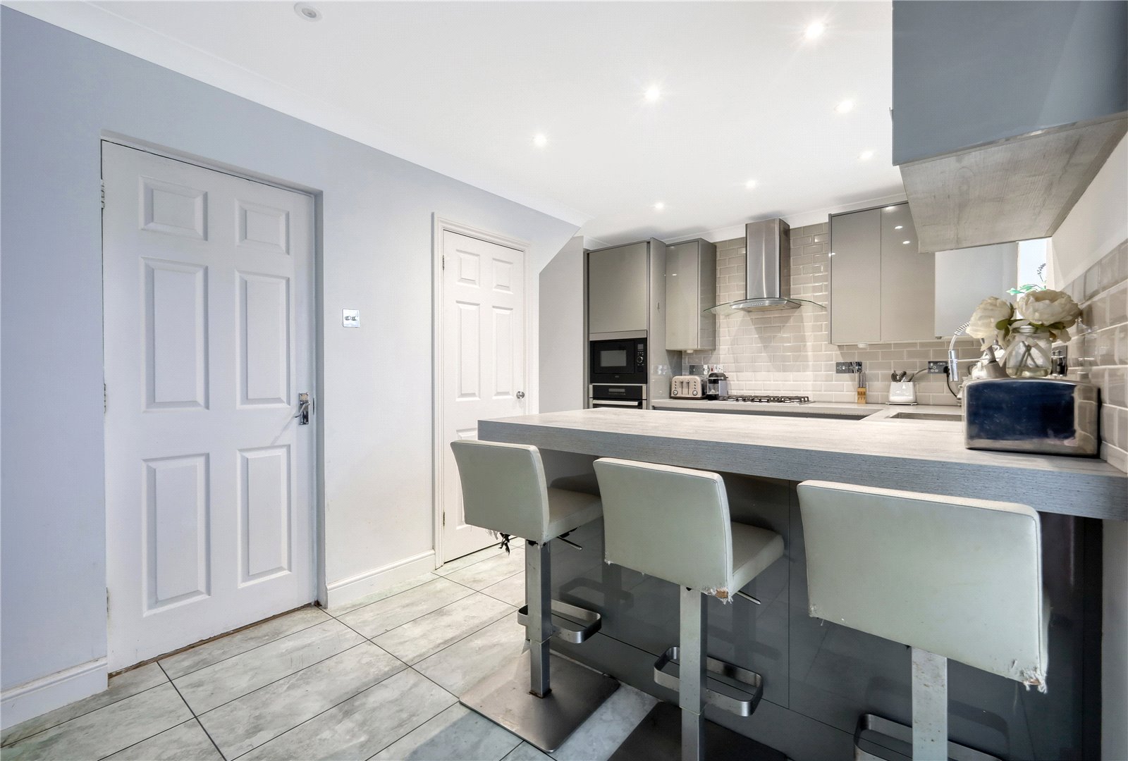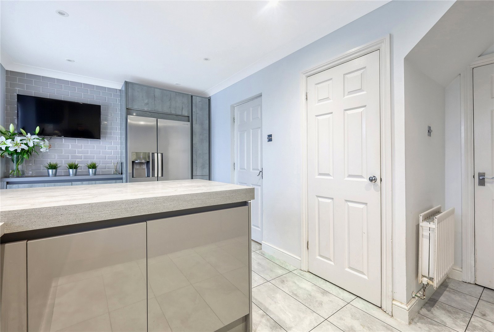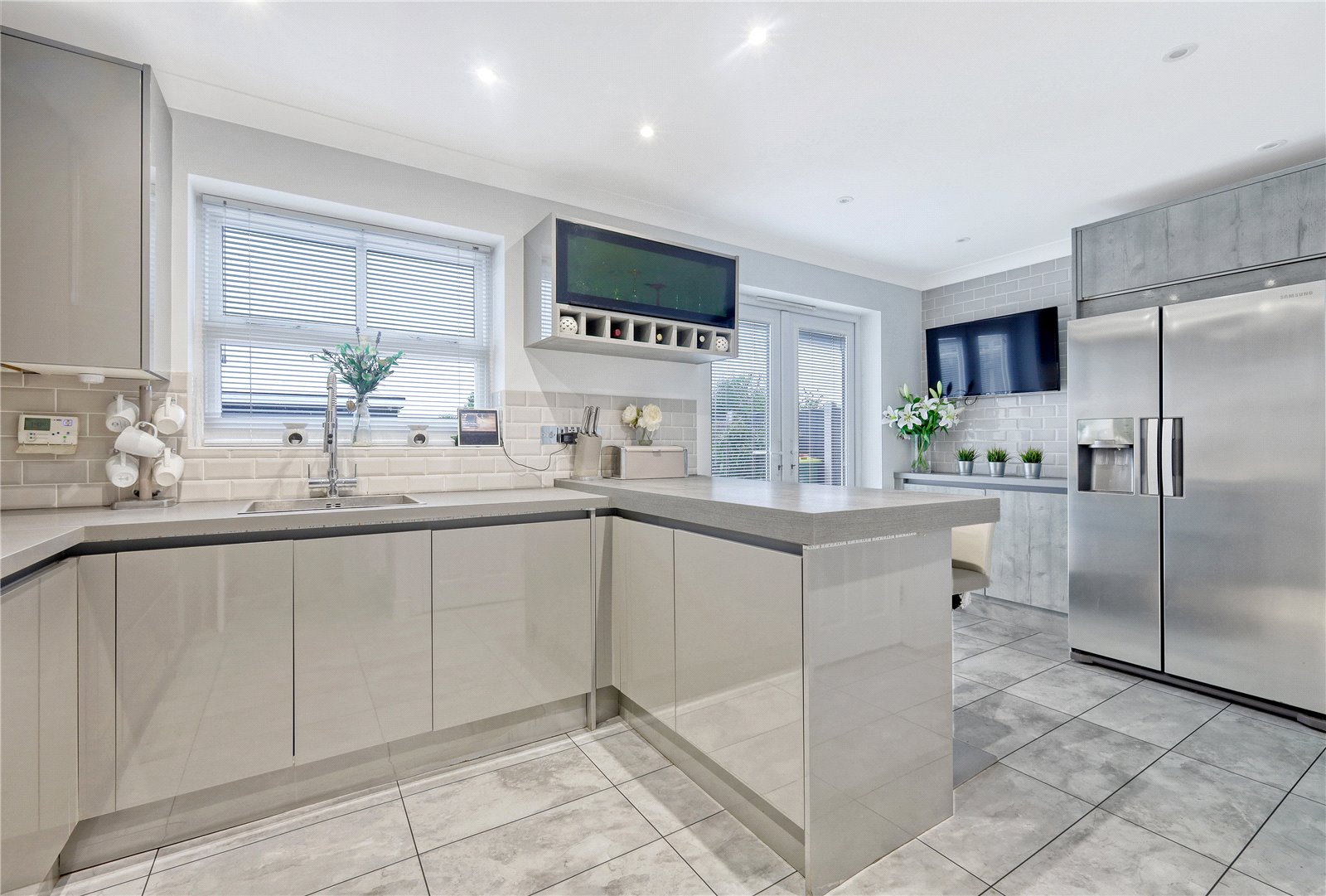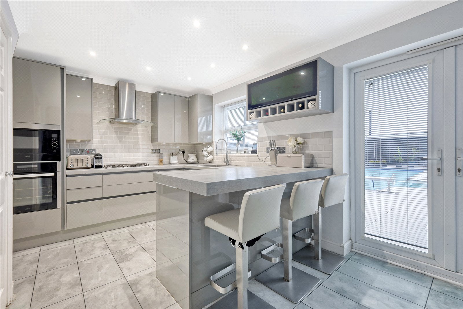 Double glazed French doors leading out to the porcelain tiled terrace and double glazed window to rear overlooking the rear garden and pool. The Kitchen area has been professionally planned and fitted with a comprehensive range of frameless gloss base and pelmeted eye level cabinets with quartz and grey oak working surfaces and inset sink unit with designer mixer tap. The range of integrated appliances include split level AEG fan assisted electric oven, microwave, dishwasher and five ring gas hob and extractor canopy above. Plumbing and drainage for automatic washing machine. Metro tiled splashbacks, peninsular breakfast bar. Double banked radiator. Access to understairs larder cupboard with shelves and storage space. Personal door to garage.