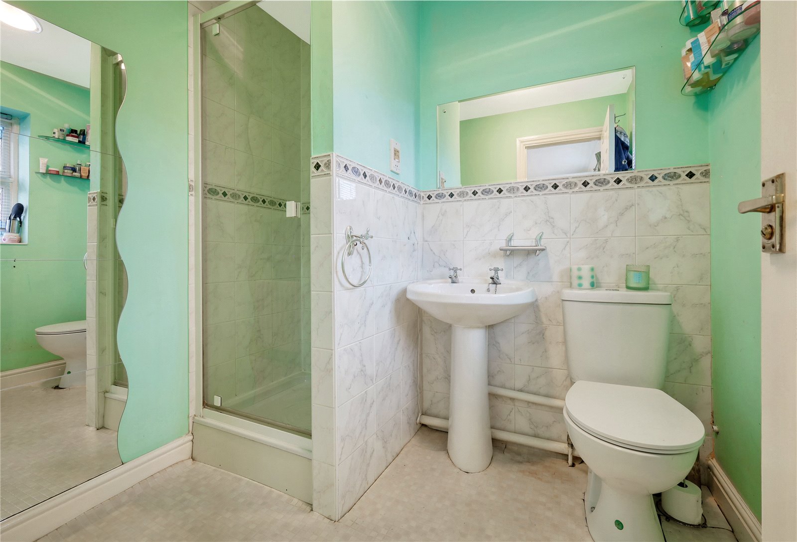Obscure double glazed coloured lead lite window to front. Radiator. Three piece suite comprising independent fully tiled 'Meynell' shower cubicle, pedestal wash hand basin and close coupled w.c. Marbleised ceramic tiling to half height with border tiles. Electric shaver point. Extractor fan. Smooth plaster ceiling.