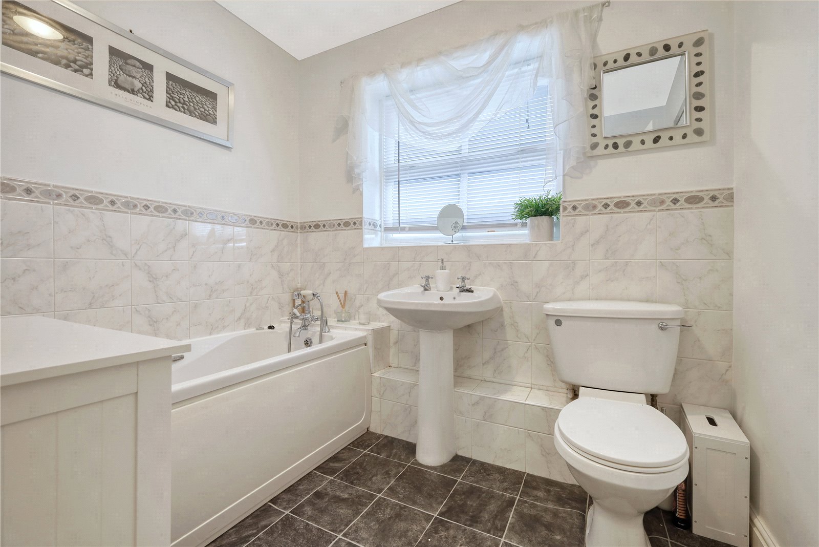Obscure double glazed window to rear. Fitted with a three piece suite comprising panel enclosed bath with chrome mixer taps and shower attachment, pedestal wash hand basin and close coupled w.c. Radiator. Marbleised ceramic tiling to all sanitary areas and half height with border tile. Extractor fan. Smooth plaster ceiling.