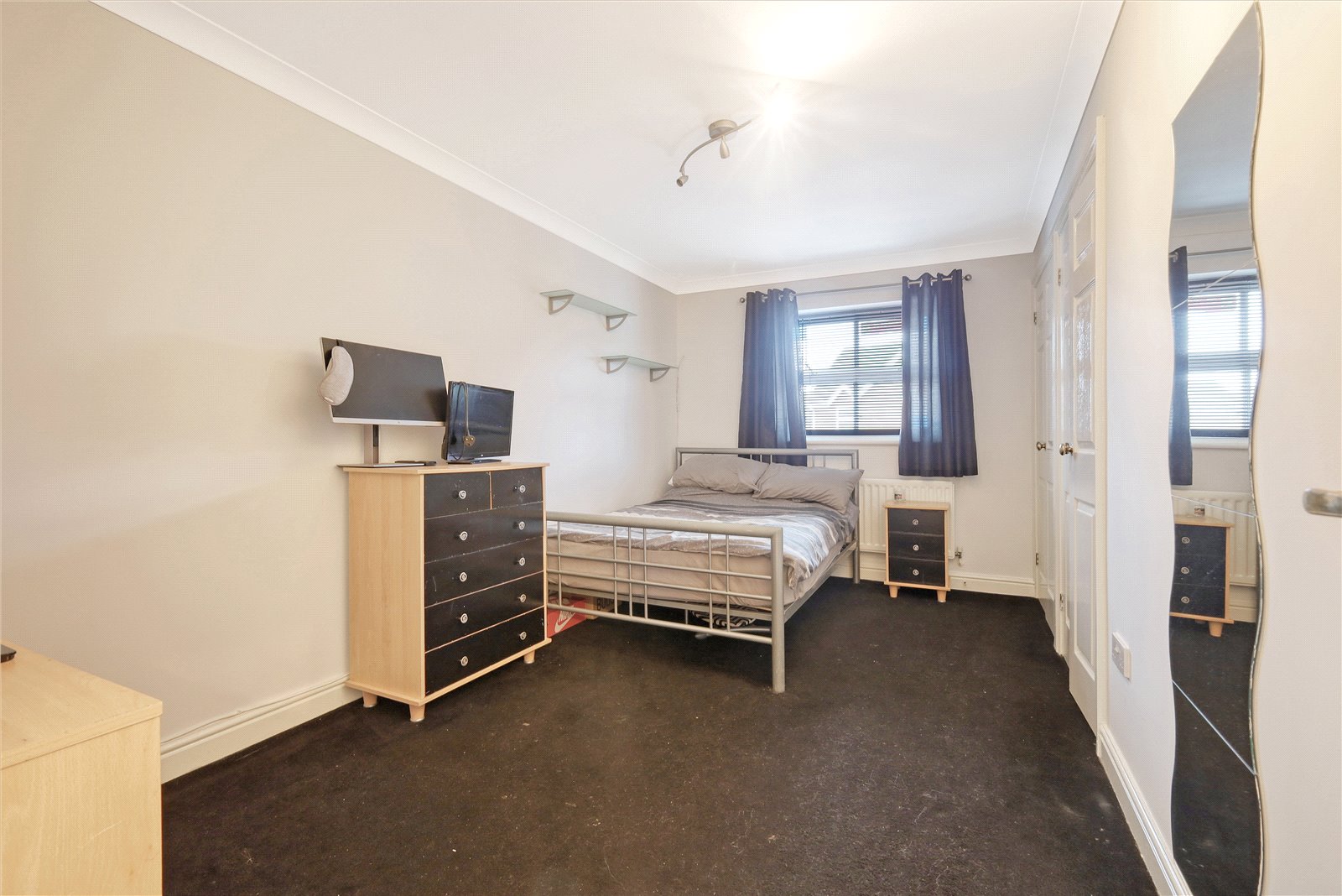 Double glazed coloured lead lite window to front. Radiator. Lipped skirting. Range of built-in bedroom furniture comprising two double fronted wardrobe cupboards with hanging and shelved storage space. Coved cornice to smooth plaster ceiling.