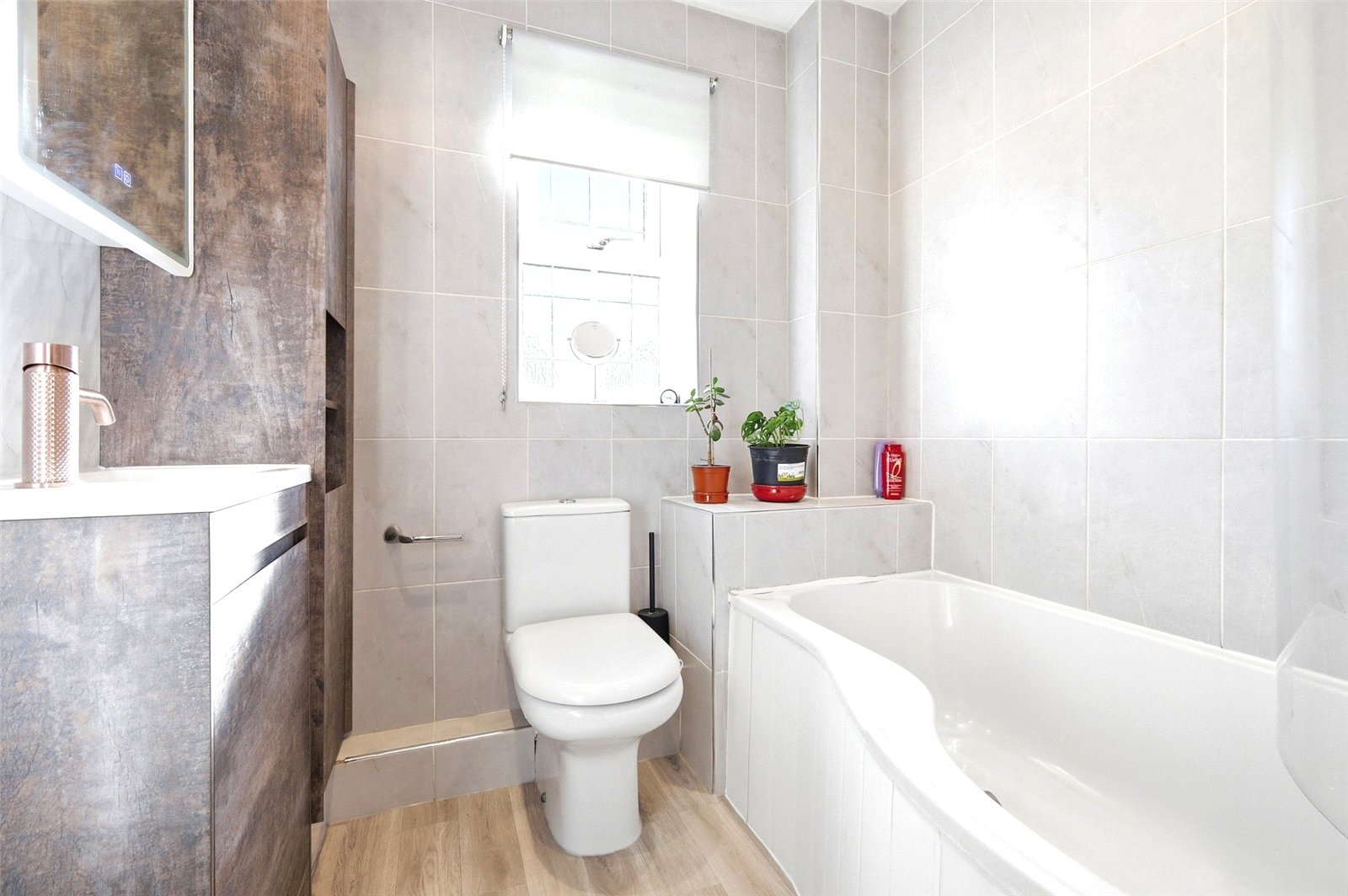Obscure uPVC double glazed multi pane window to front. A remodelled and fully tiled contemporary family bathroom comprising P-shaped bath with frameless glass shower screen, mixer tap with shower attachment and independent shower above, dual flush close coupled WC, and vanity wash handbasin with matching full height adjacent cabinetry and designer mixer tap. Full height heated towel rail. Marbonyx panelling to one wall, and full tiling to remainder with aluminium bordered edging. Recessed LED Lighting. Extractor fan. Drop light switch.