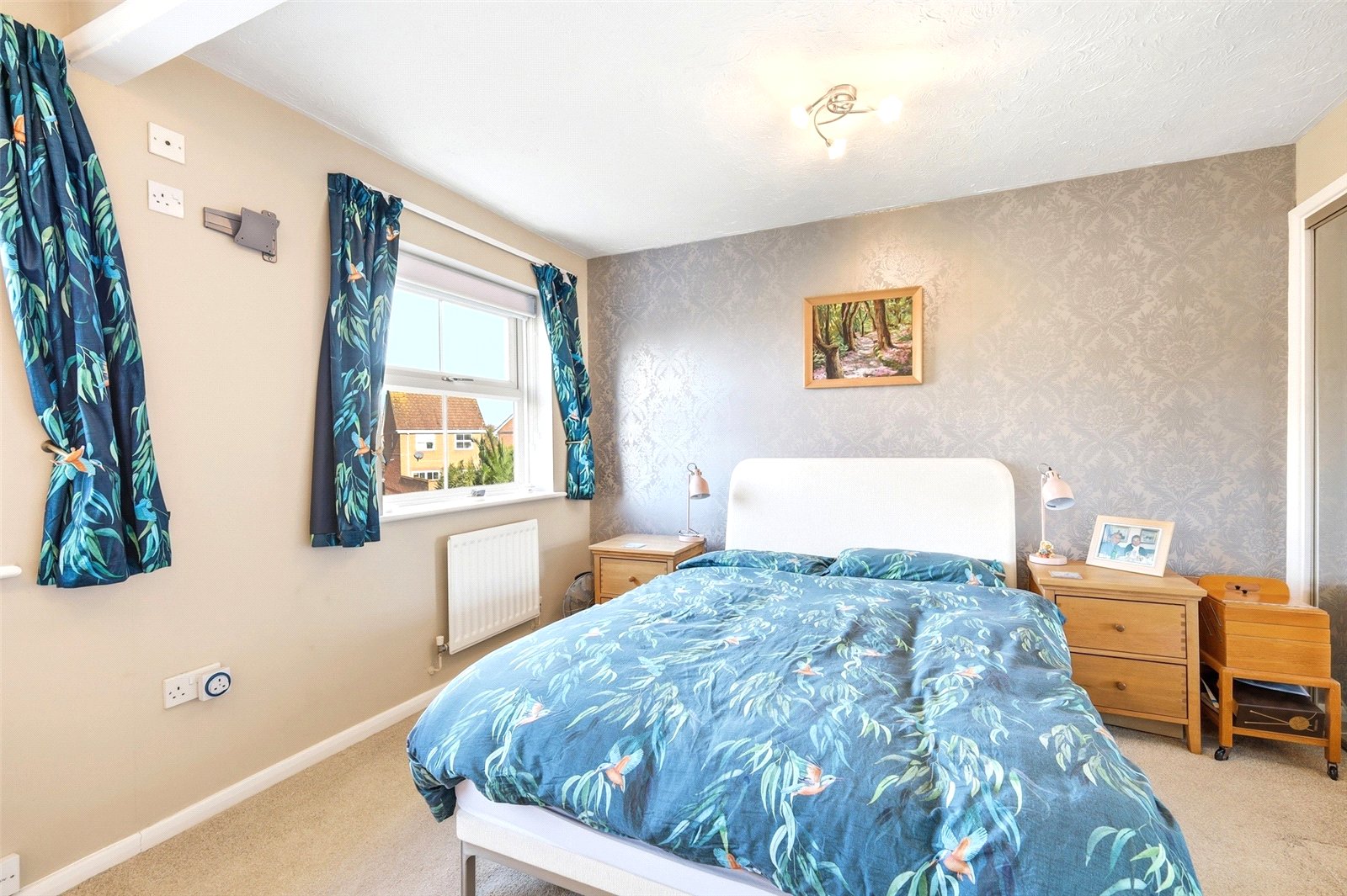 uPVC double glazed multi pane window to front. Radiator. Beech effect flooring. Range of fitted bedroom furniture comprising triple mirror fronted fitted wardrobe cupboard with hanging and shelved storage space, and adjacent drawer stack