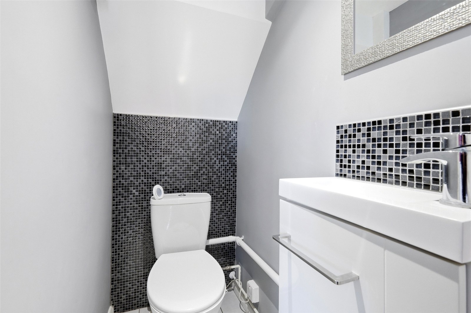Fitted with a two piece suite comprising of dual flush close coupled WC and vanity wash hand basin with waterfall designer mixer tap, mosaic tiled splashback and storage cabinet beneath. Feature tiling to one wall with aluminium bordered edging. Recessed LED lighting. Drop light switch.