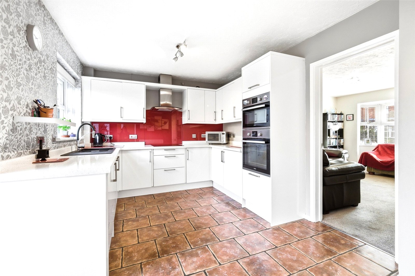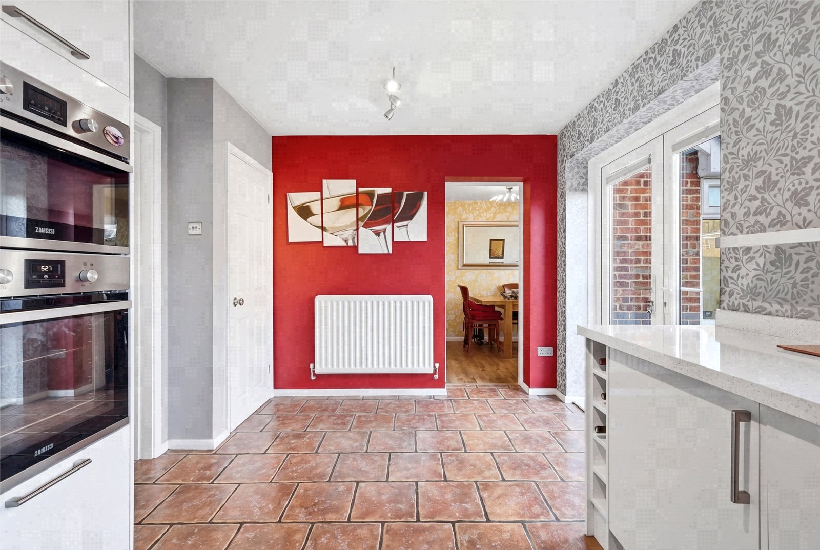 A pair of uPVC double glazed French doors give access to the landscaped rear garden, and a uPVC double glazed cottage style window overlooks the rear garden. The kitchen area has been refitted with a comprehensive range of base and pelmetted eyelevel cabinets in gloss white units with quartz effect squared edged working surfaces and inset one and a quarter bowl polycarbonate sink unit with designer mixer tap and vegetable wash. The range of integrated appliances includes split level fan assisted electric oven with integrated convection microwave, four ring induction hob with designer brushed steel extractor canopy above, integrated dishwasher and fridge. Quarry tiled rumbled stone floor. Double banked radiator. Access to: