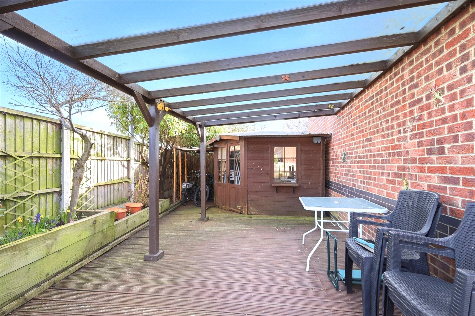 The rear garden is a particularly fine feature of this family home as the property stands on a prominent corner plot. There is an extra width west facing rear garden unoverlooked, with full height fenced side boundary, and an extensive side pergola covered outdoor entertaining area with timber retained raised flowerbeds and ample space for dining alfresco under a Perspex roofed dining area. Hardstanding for access to detached summerhouse with multi pane windows to front, previously fitted as an entertaining area. The garden has been attractively landscaped with raised and tiered planted flower and shrub borders. There is a brick block paviour footpath that leads to the side of the property where there is secure timber gated side access to the front driveway. External security lighting. Hardstanding for additional garden shed.