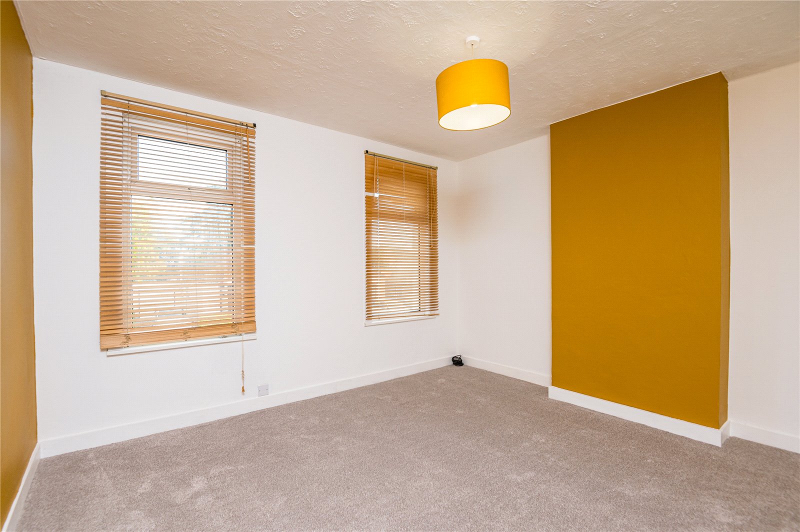 Twin double glazed windows to front. High level skirting. Radiator. Access to over-stairs storage cupboard/wardrobe.