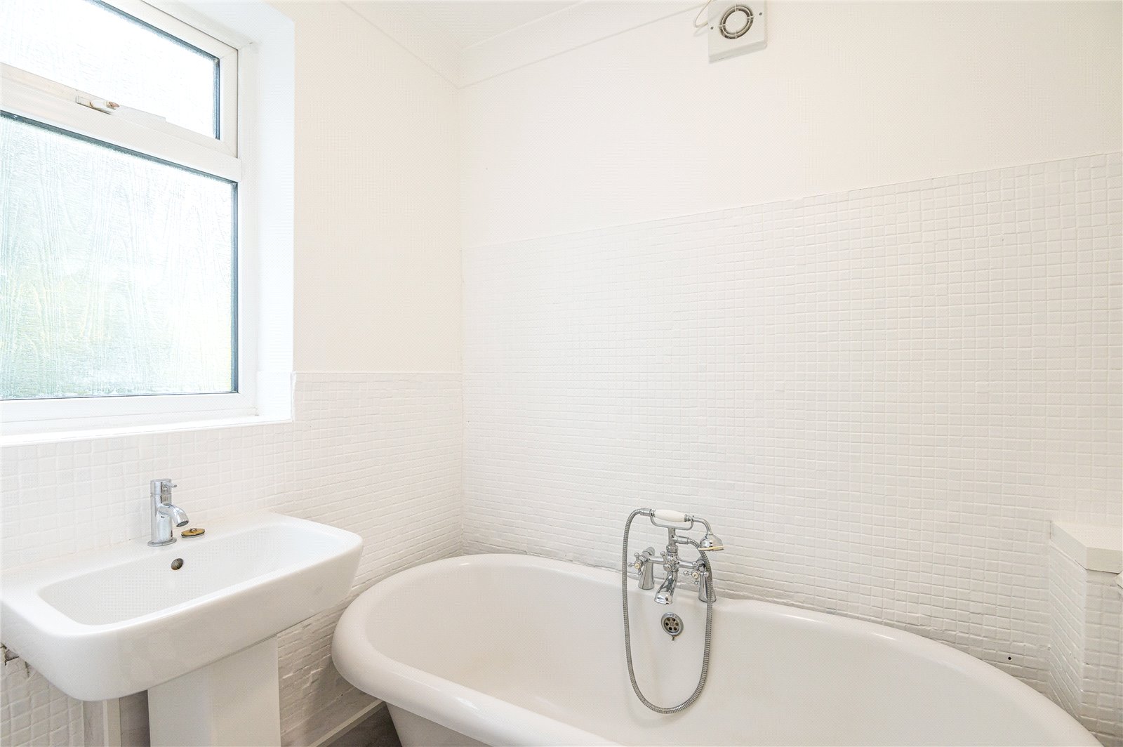 Obscure double glazed window to side. Fitted with a three piece suite comprising claw foot rolled edged bath with chrome telephone mixer tap and shower attachments, pedestal wash handbasin, and regency style WC. Radiator. Mosaic tiling to half height. Extractor fan. Coved cornice to smooth plastered ceiling.