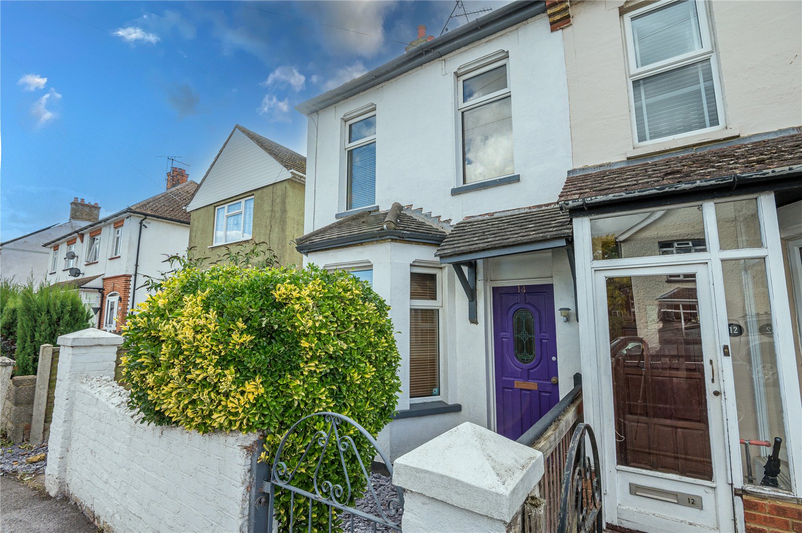 The property has a walled frontage with wrought iron gated access to a footpath to the entrance, and slate shingled front garden.