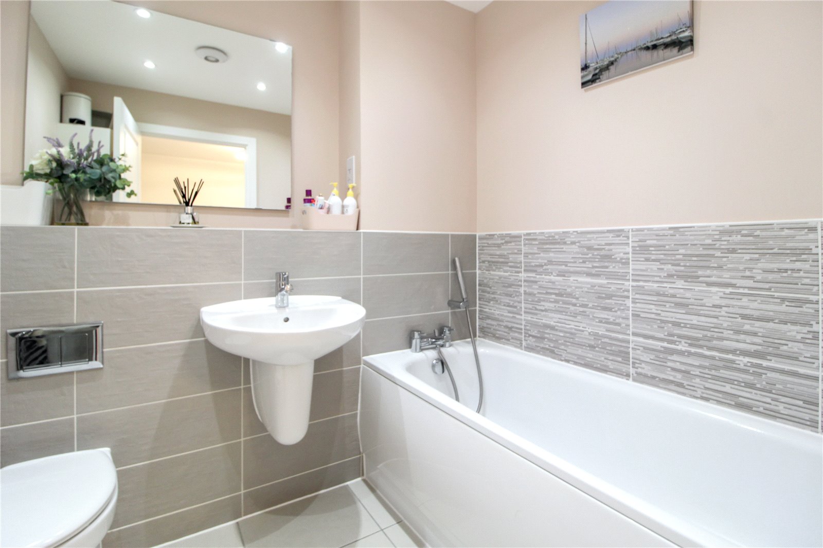 Fitted with a three-piece white suite comprising panel enclosed bath with chrome monobloc mixer tap and shower attachment, wall-mounted wash basin with chrome monobloc mixer tap, low level w.c. Tiled floor. Wall-mounted heated towel rail. Storage cupboard. Tiling to bath and sanitaryware areas with the remainder of the walls and ceiling being smooth plastered. Spotlights and extractor fan.