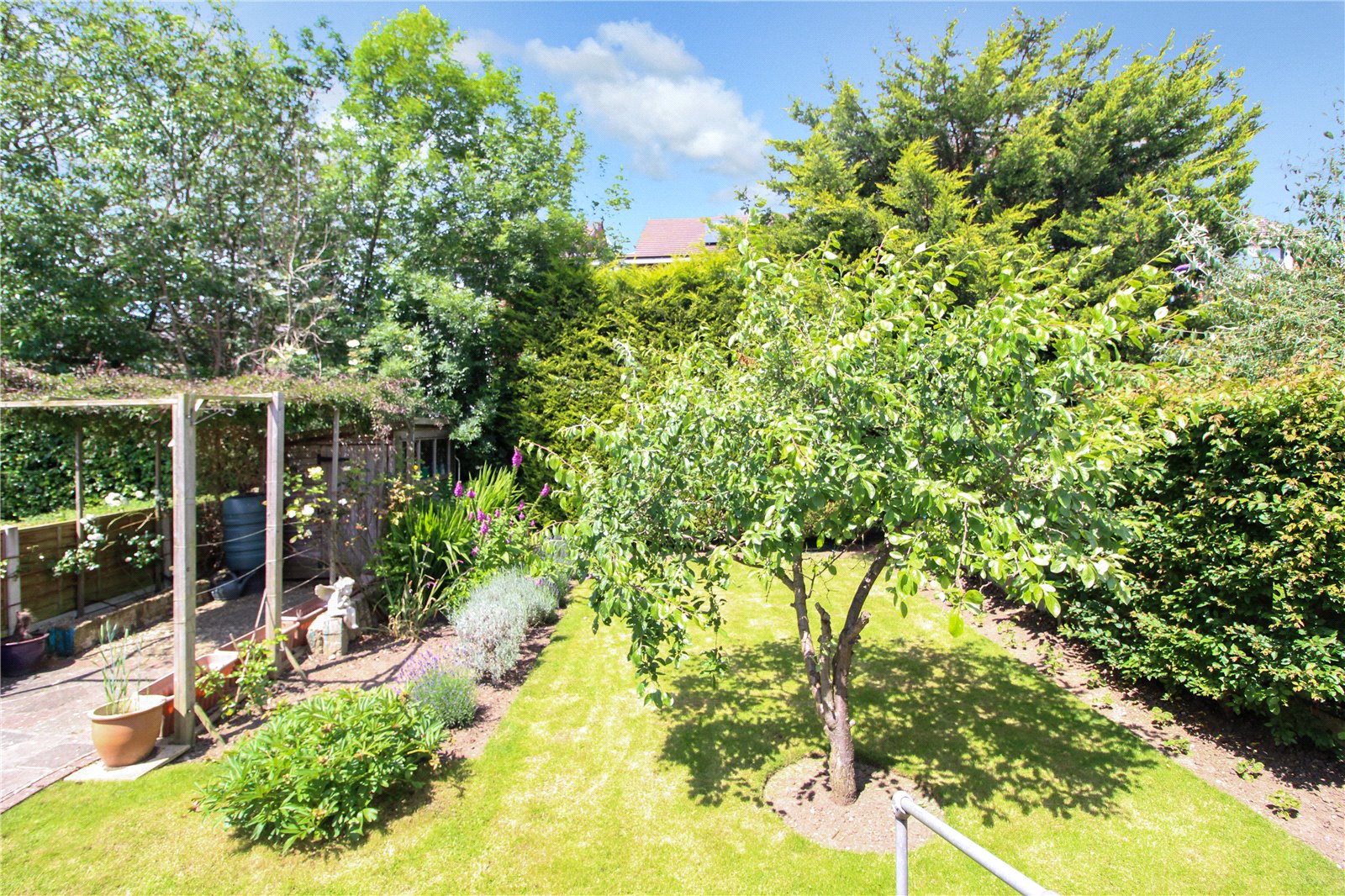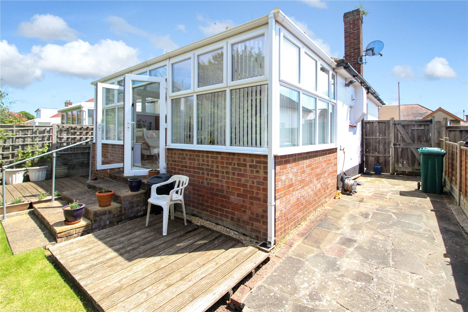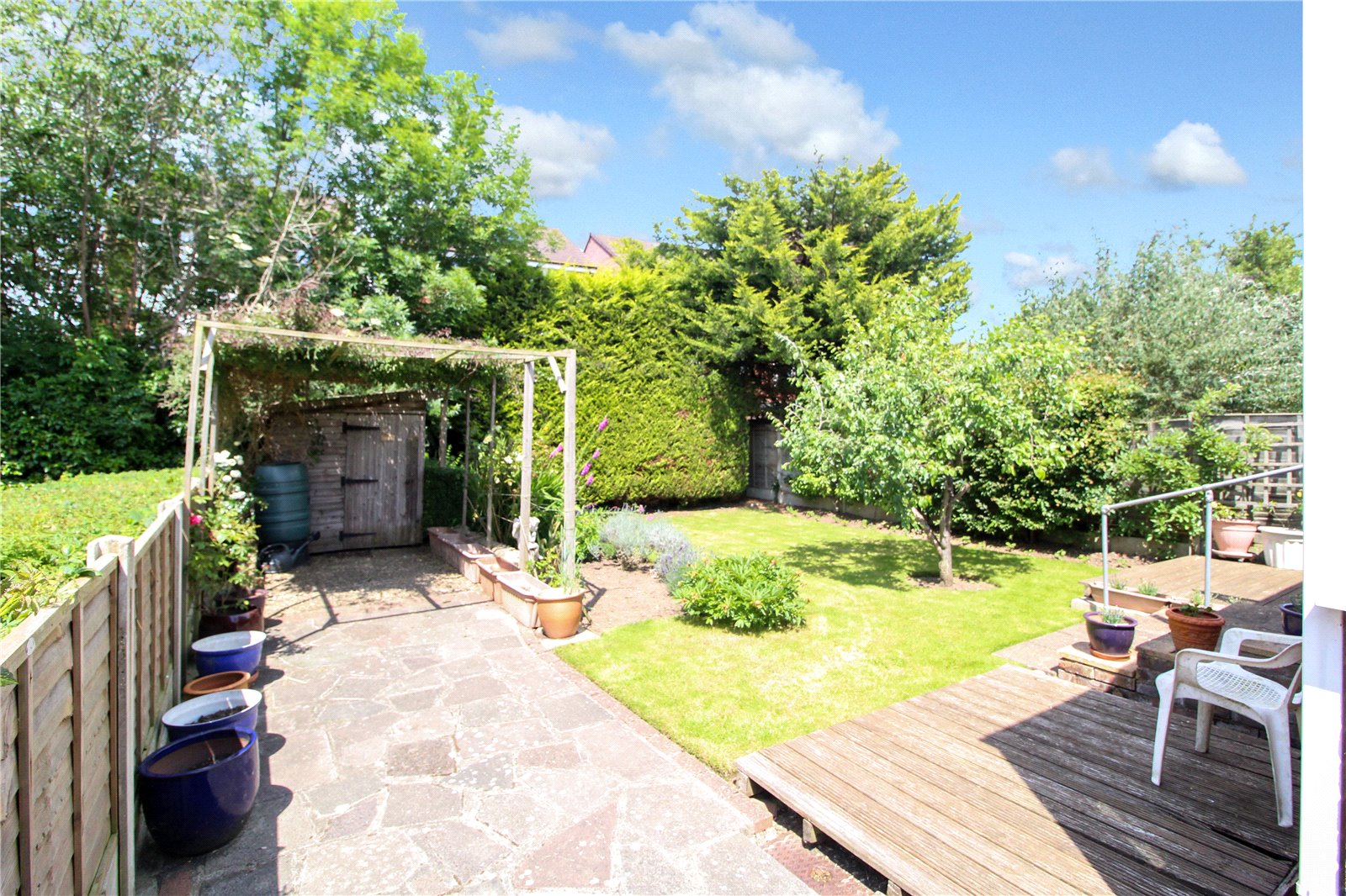 The garden is accessed via the conservatory, initially you step out onto decked area, with rest of garden laid to lawn, there is a shed and side access via large wide paved area.