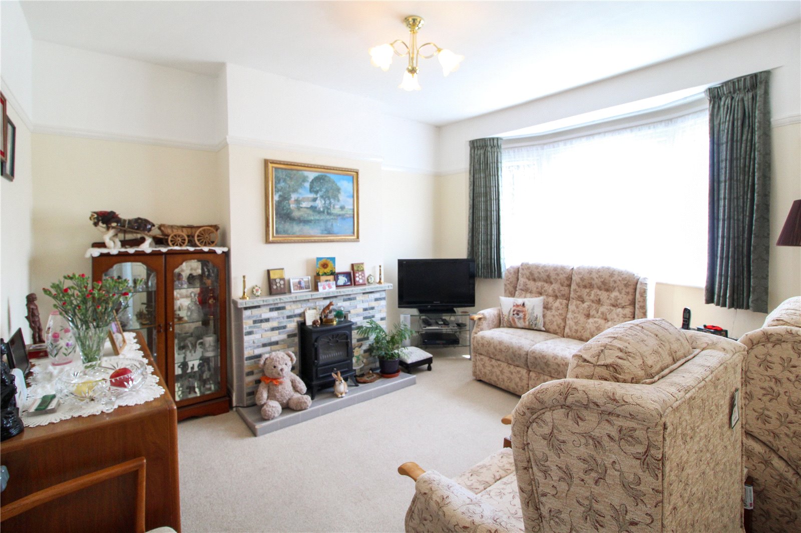Double glazed bay window to front, carpet to floor, smooth ceiling, ceiling light, radiator, feature fireplace.