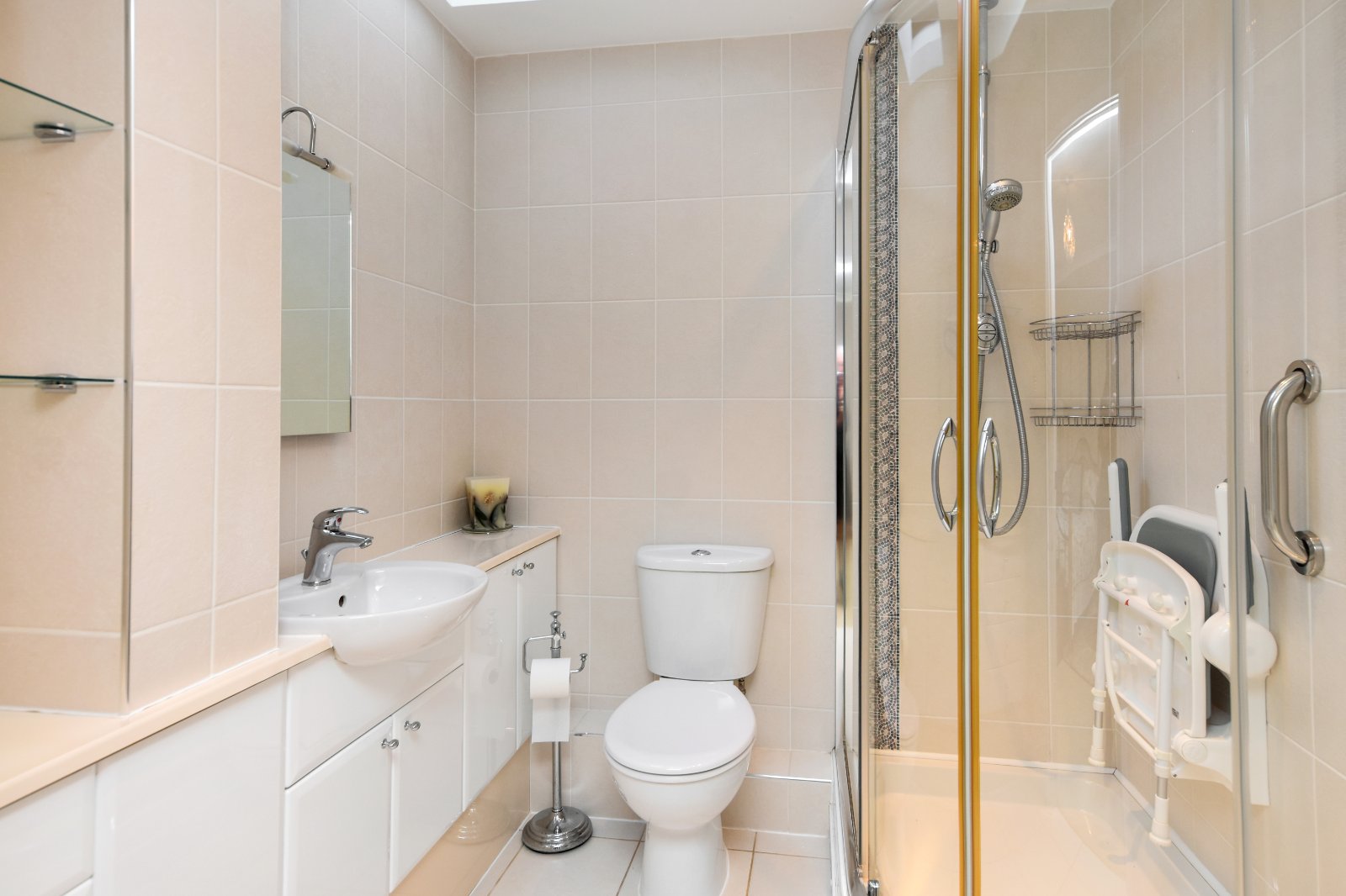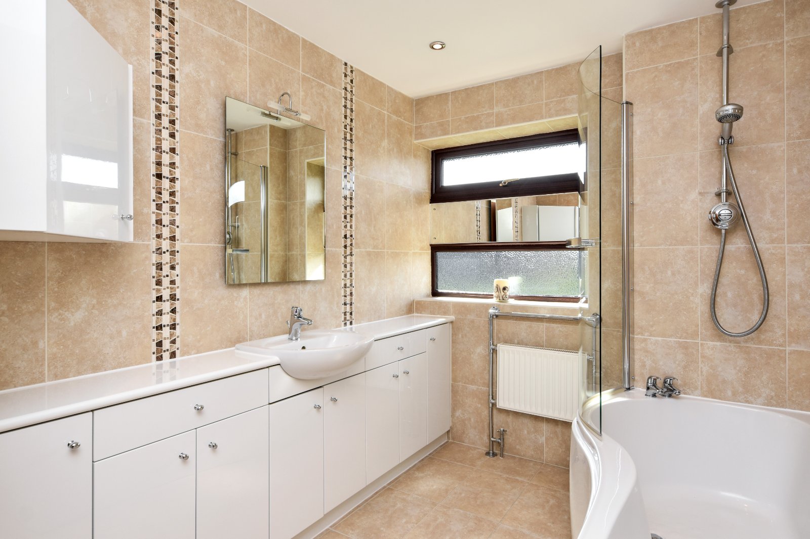 Obscure uPVC double glazed window panel windows rear aspect inset with central mirror. The modern suite comprises panelled enclosed shaped 'shower bath' fitted with curved shower screen, mixer tap and integrated shower, concealed cistern dual flush wc with storage cupboards to either side with workshop/shelf over. To one aspect is a fitted vanity unit with ample worktop space inset with wash hand basin with mixer tap over, wall mounted mirror, with ample storage cupboards under. Matching wall mounted 'corner' bathroom cabinet. Radiator with heated towel rail surround. Tiling to all visible walls with attractive border tile inlay and matching floor tiling. Coving to smooth plastered ceiling inset with recessed lighting.