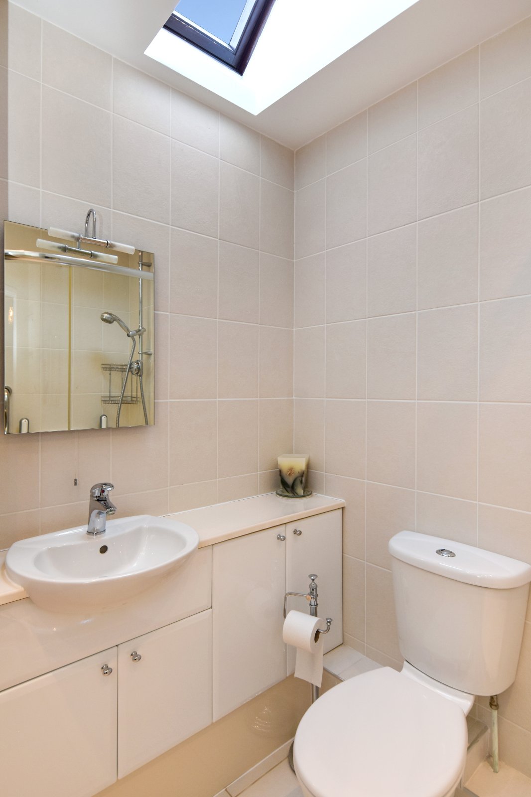 Feature double glazed 'vaulted' velux style window. The modern three piece suite comprises double width shower enclosure with integrated shower unit, dual flush wc and vanity wash hand basin with mixer tap over, with ample storage cupboards under. The vanity unit area extend to a recessed niche area with glass shelving inset and drawer stack under worktop area. Ladder style heated towel rail. Tiling to all visible walls with attractive border tile inlay. Floor tiling. Wall mounted mirror over sink. Coving to smooth plastered ceiling inset with recessed lighting.