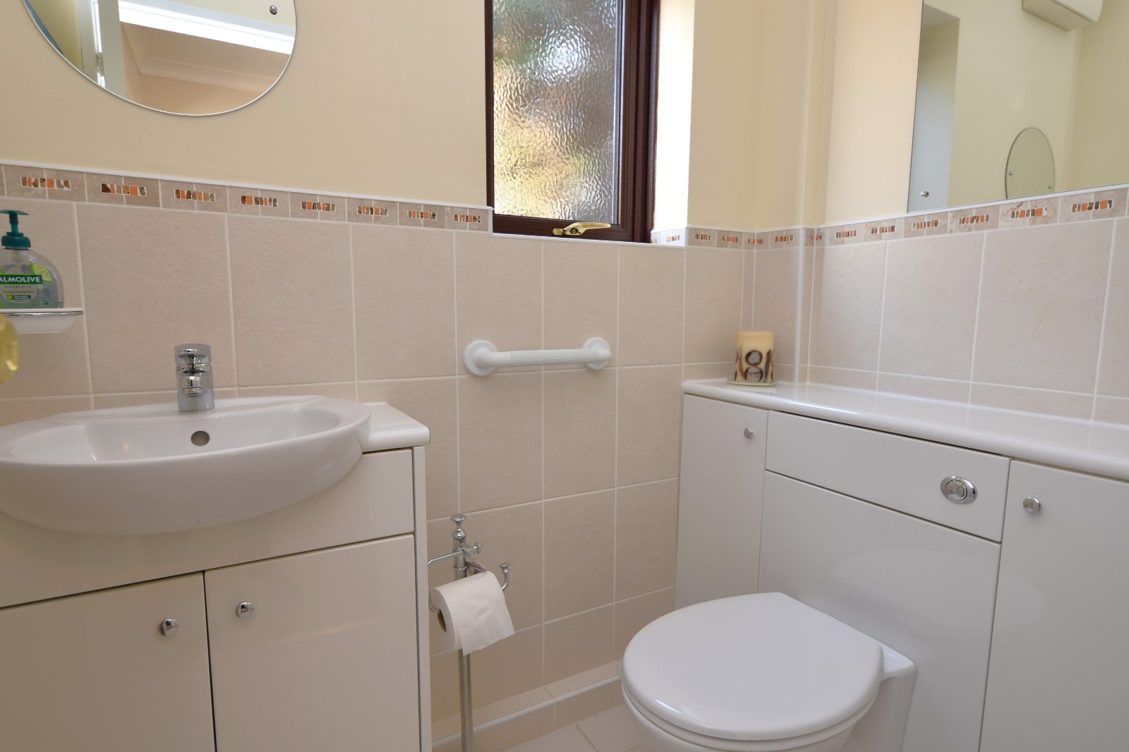 Obscure uPVC double glazed window to side aspect. The modern white two piece suite comprises concealed cistern dual flush wc with storage cupboards to either side with workshop/shelf over and vanity wash hand basin with mixer tap over and storage cupboard under. Partly tiled walls. Floor tiling. High level fuse board. Radiator. Coving to smooth plastered ceiling inset with recessed lighting.