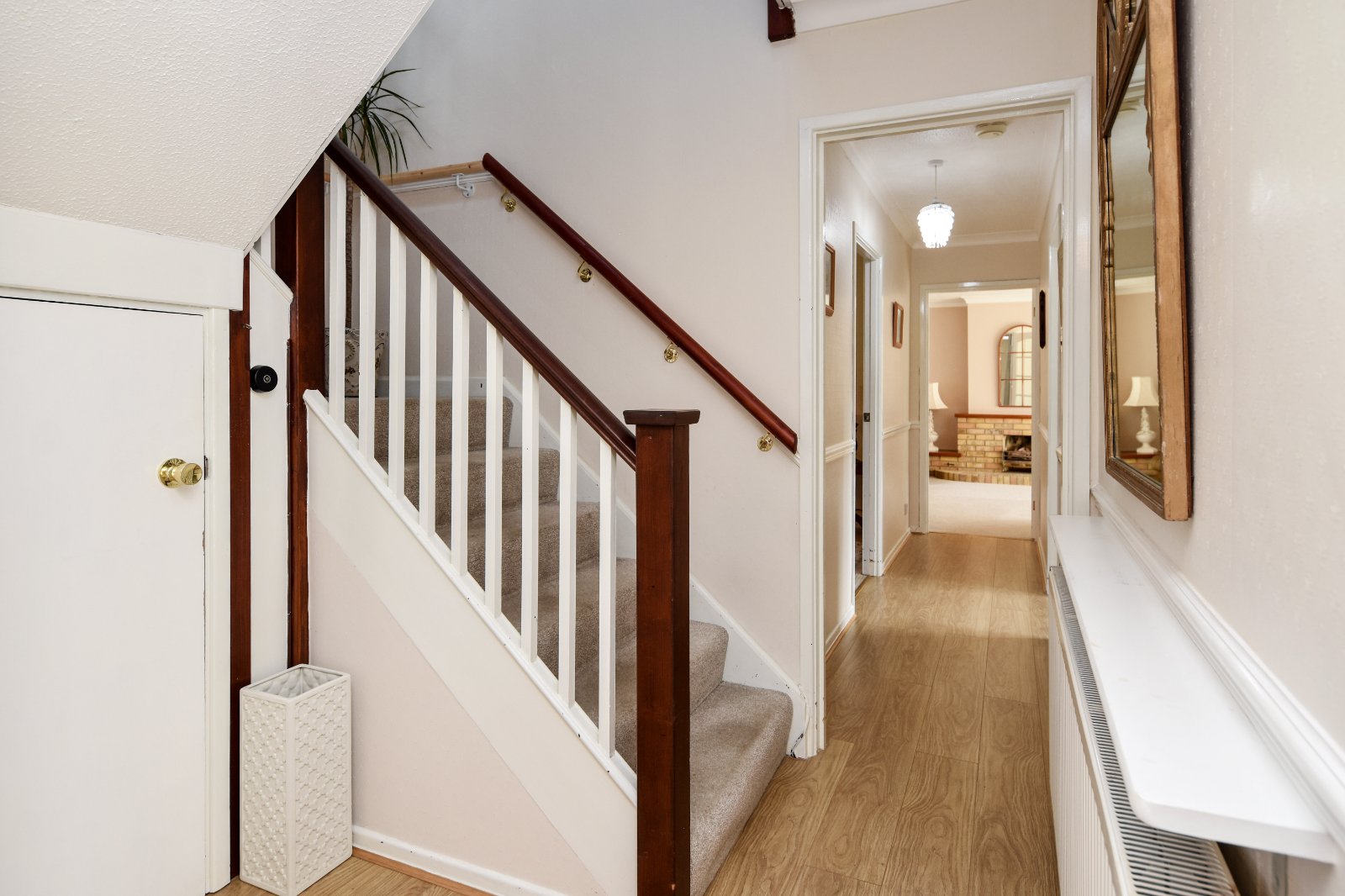Laminate wood effect flooring. Radiator. Open access to turned staircase to first floor accommodation with spindle balustrade and under stairs cupboard/storage space. Thermostat control panel. Dado rail. Part glazed doors to all ground floor rooms. Coving to textured ceiling. Further door to;