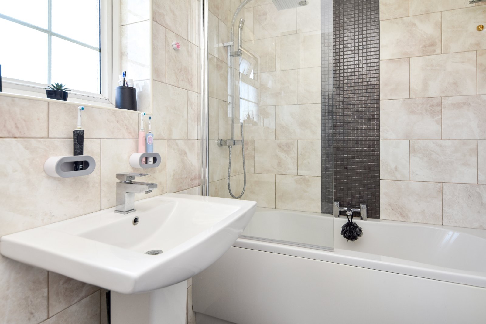 Obscure Georgian style double glazed window to front aspect. A modern and stylishly Bathroom fitted with a three-piece white suite comprising a low-level dual flush WC, pedestal wash hand basin with chrome mixer tap, and a panelled enclosed bath with overhead rainfall shower and separate handheld attachment, complete with glass screen. Finished with full-height tiling to walls in a neutral tone, contrasting feature tiling to the shower area, and complementary tiled flooring. Chrome heated towel rail. Smooth plastered ceiling inset with ceiling mounted extractor fan.