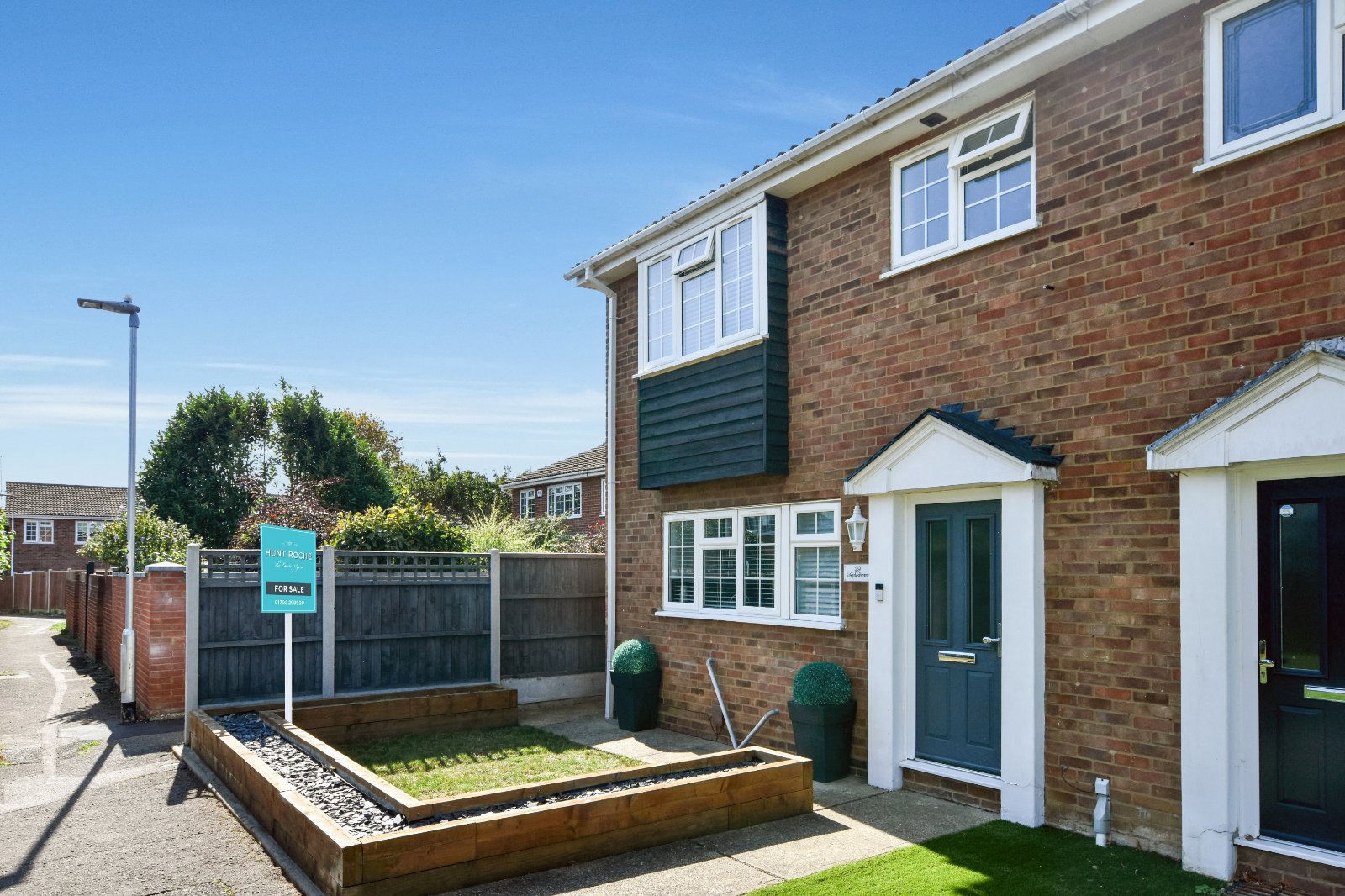 The property is approached via a neatly landscaped front garden with a raised sleeper-edged border filled with decorative slate chippings and shrubs, offering a low-maintenance finish. A central pathway leads to the Regency-style entrance door, with an additional side gate giving access to the rear garden.