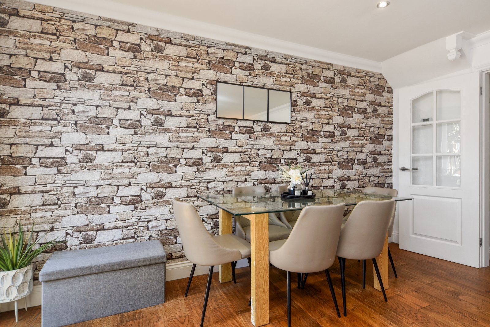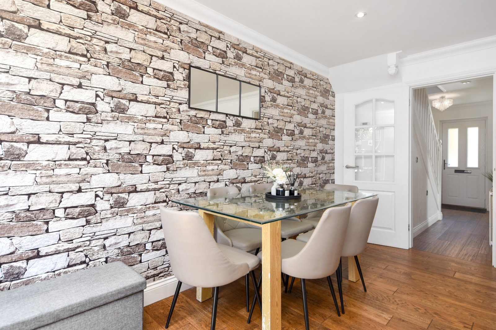 A generous and well-presented reception space, enjoying excellent natural light from a wide uPVC Georgian style double glazed window to the rear and matching obscure double glazed door opening directly onto the west-facing garden. The room offers ample space for both living and dining areas, with a feature stone-effect wall adding character to the dining section. Attractive engineered wood flooring. Radiator. Coving to a smooth plastered ceiling, inset with recessed lighting to the Dining Room.