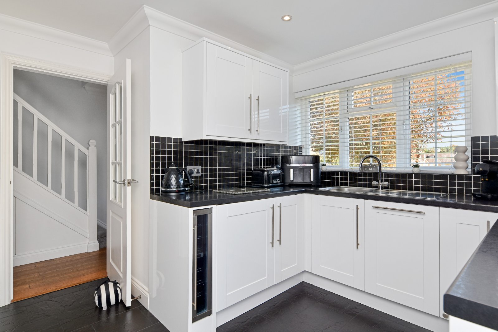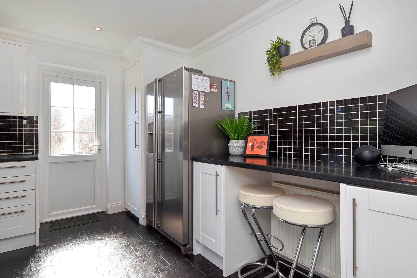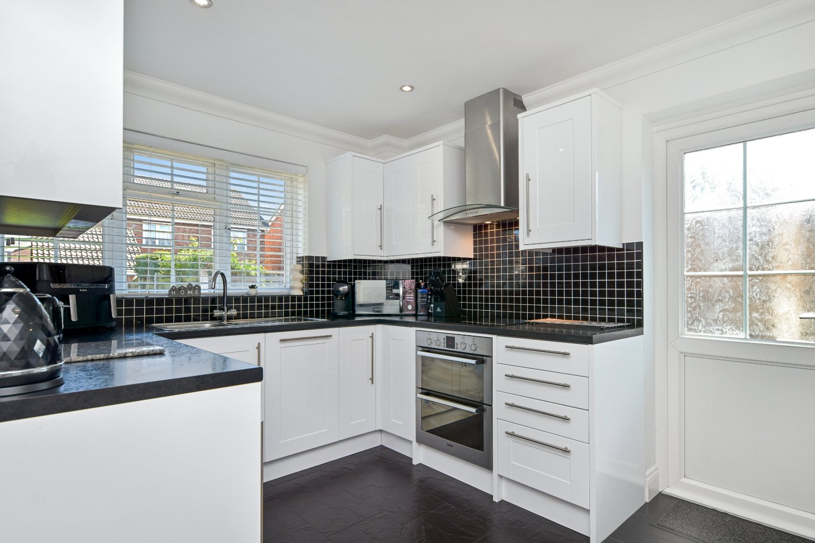 uPVC Georgian style double glazed window overlooking the green to the front aspect. A modern and stylishly presented Kitchen, fitted with a comprehensive range of white Shaker-style eye and base level units complemented by sleek black tiled splashbacks and contrasting work surfaces inset with single drainer sink unit with mixer tap over. Integrated appliances include a double 'Bosch' oven with four-ring electric hob and extractor canopy above. Space is provided for an American-style fridge/freezer (Please note that this may be available under separate negotiation), Door to built-in cupboard providing storage space and housing recently installed wall mounted boiler (April 2025). A useful breakfast bar provides informal seating. uPVC double glazed door opening to the walkway with access to the rear garden and frontage. Tiled flooring. Coving to smooth plastered ceiling inset with recessed lighting.