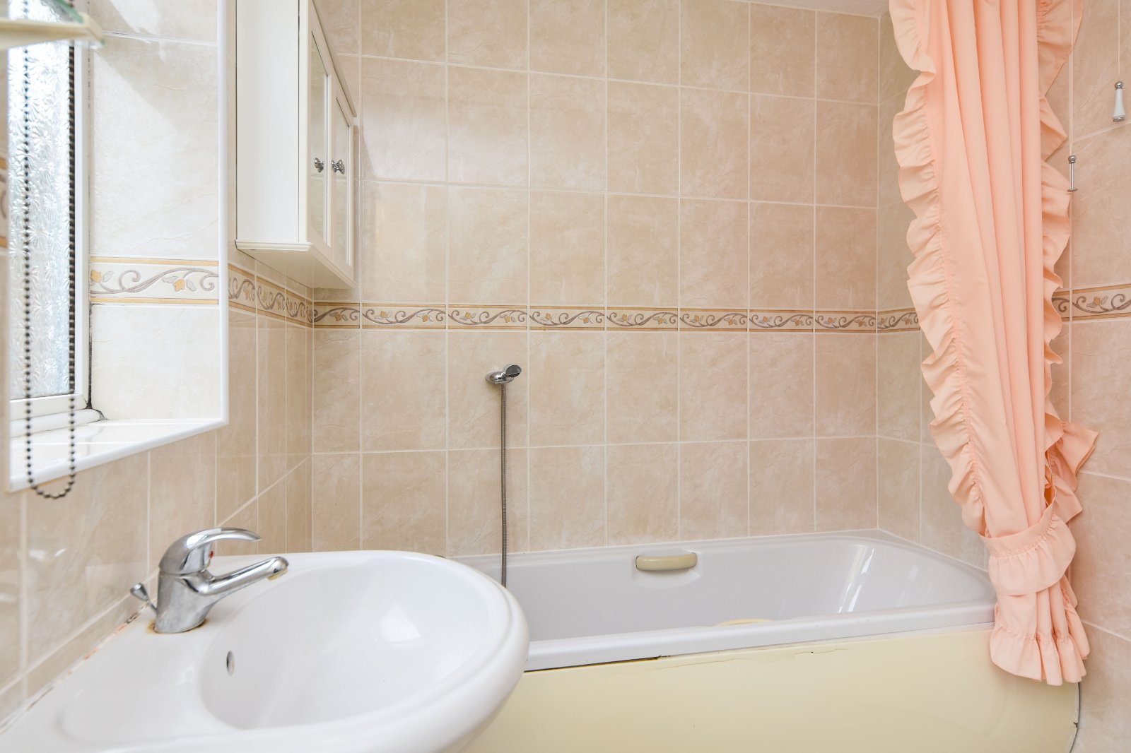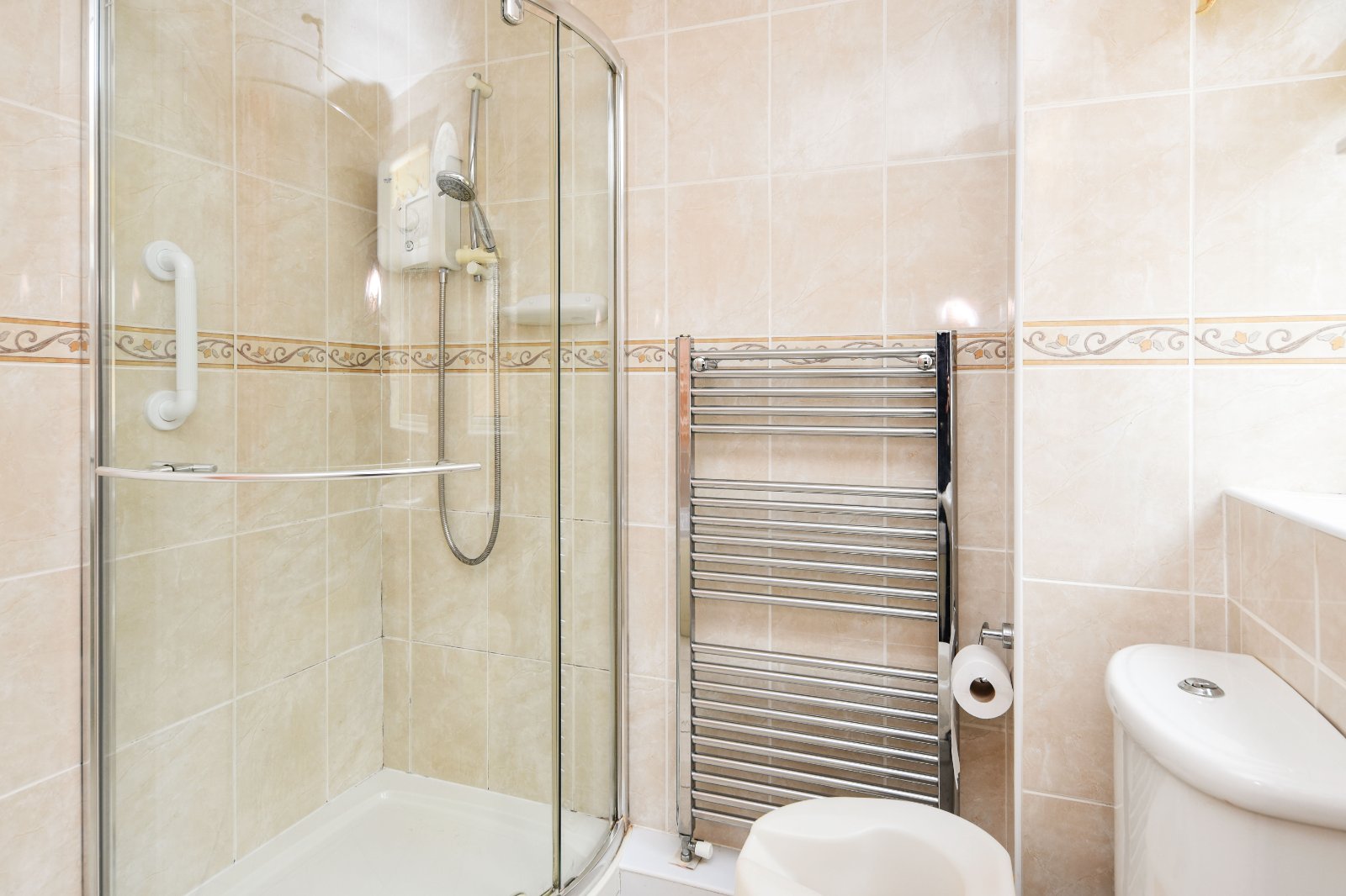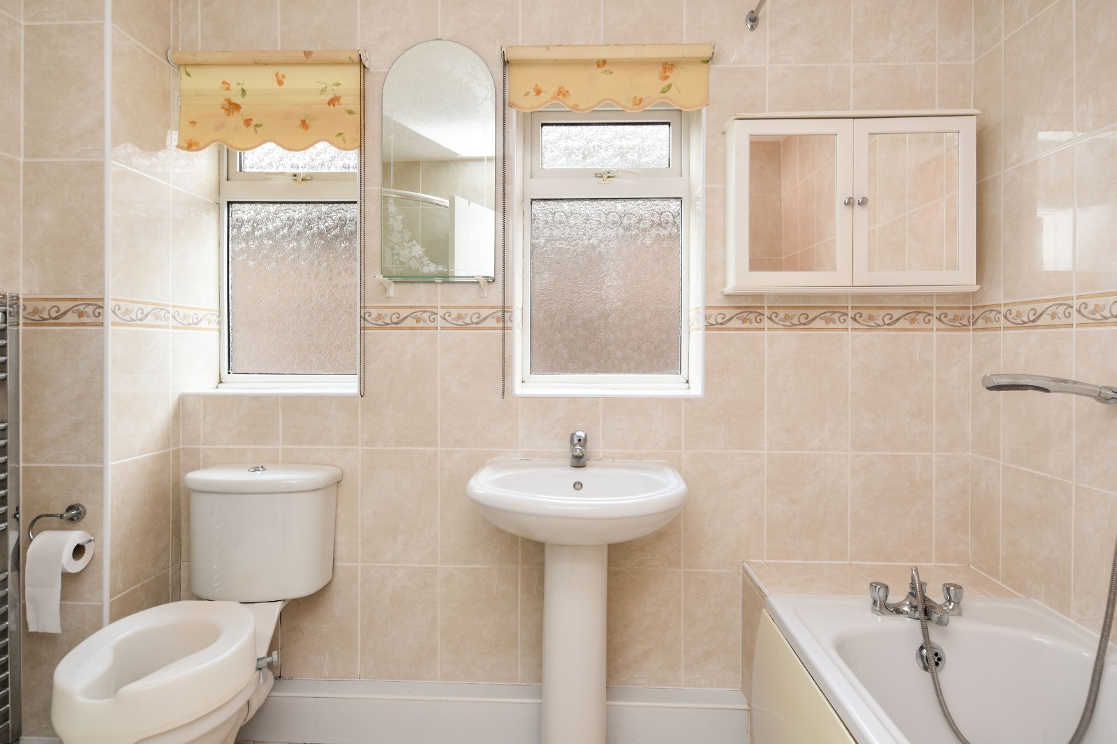 Pair of obscure uPVC double glazed windows to side aspect. The four piece suite comprises panelled enclosed bath with hand grips, mixer taps over with shower attachment, independent shower enclosure with wall mounted Triton electric shower, pedestal wash hand basin and dual flush wc. Tiling to all visible walls inset with border tile inlay. Tiled flooring. Ladder style heated towel rail. Papered ceiling.