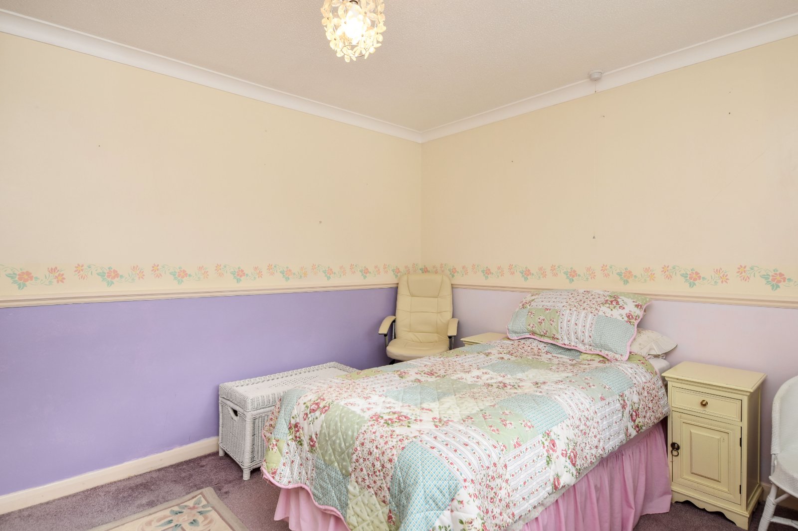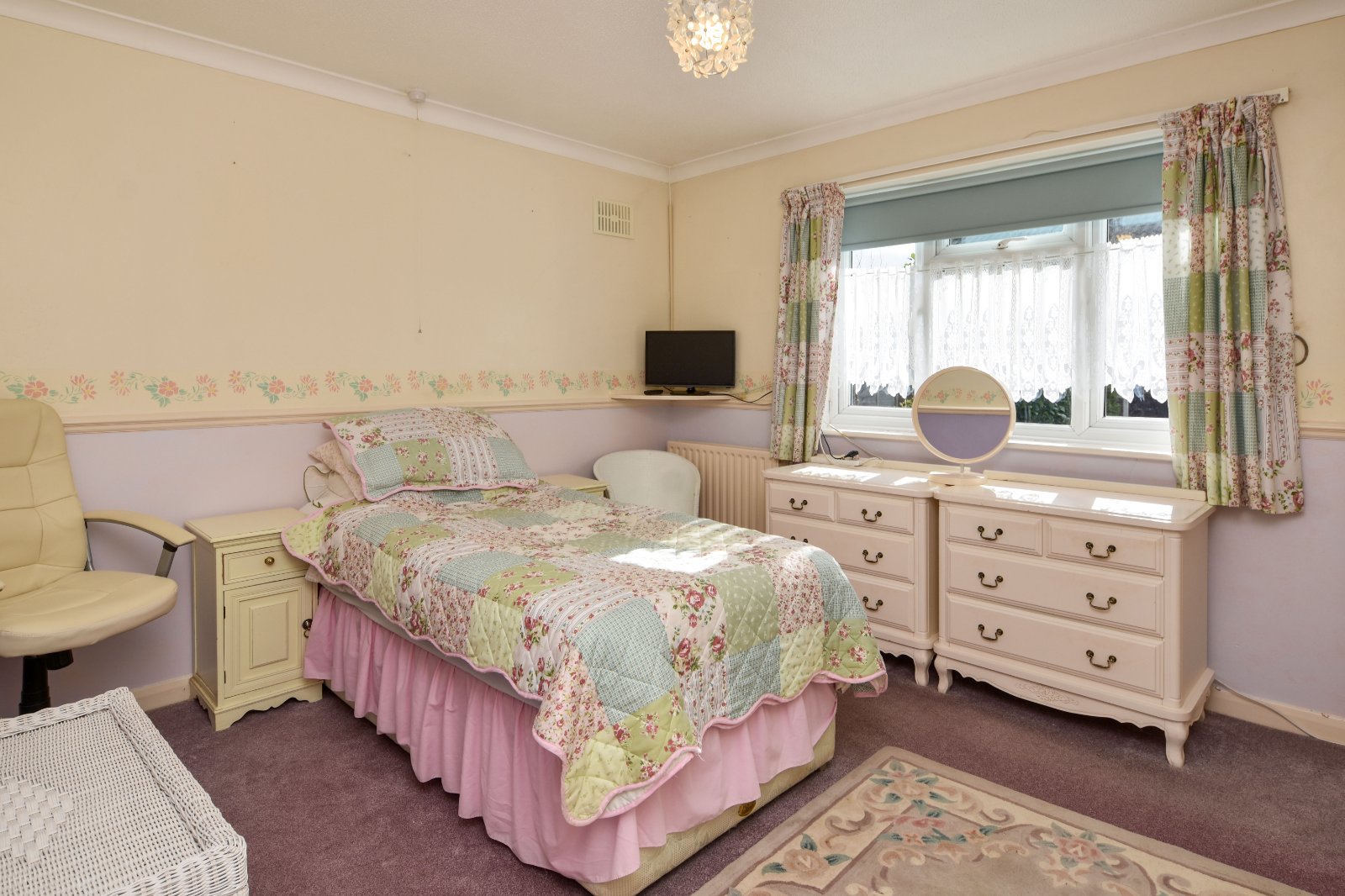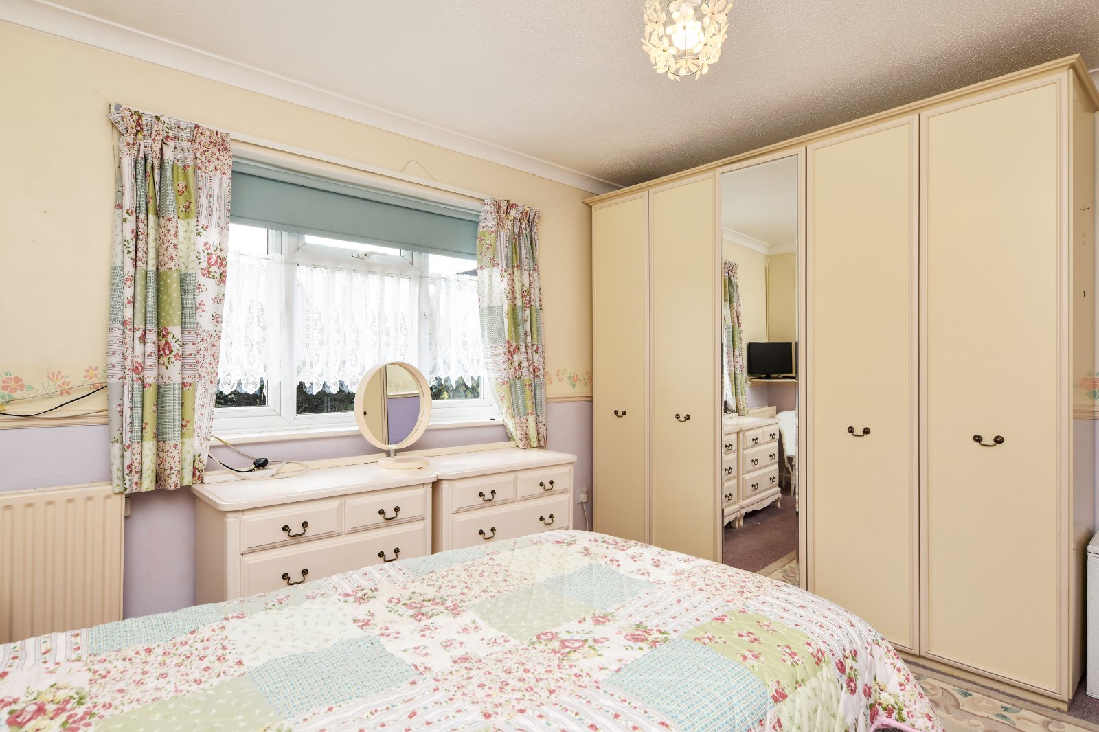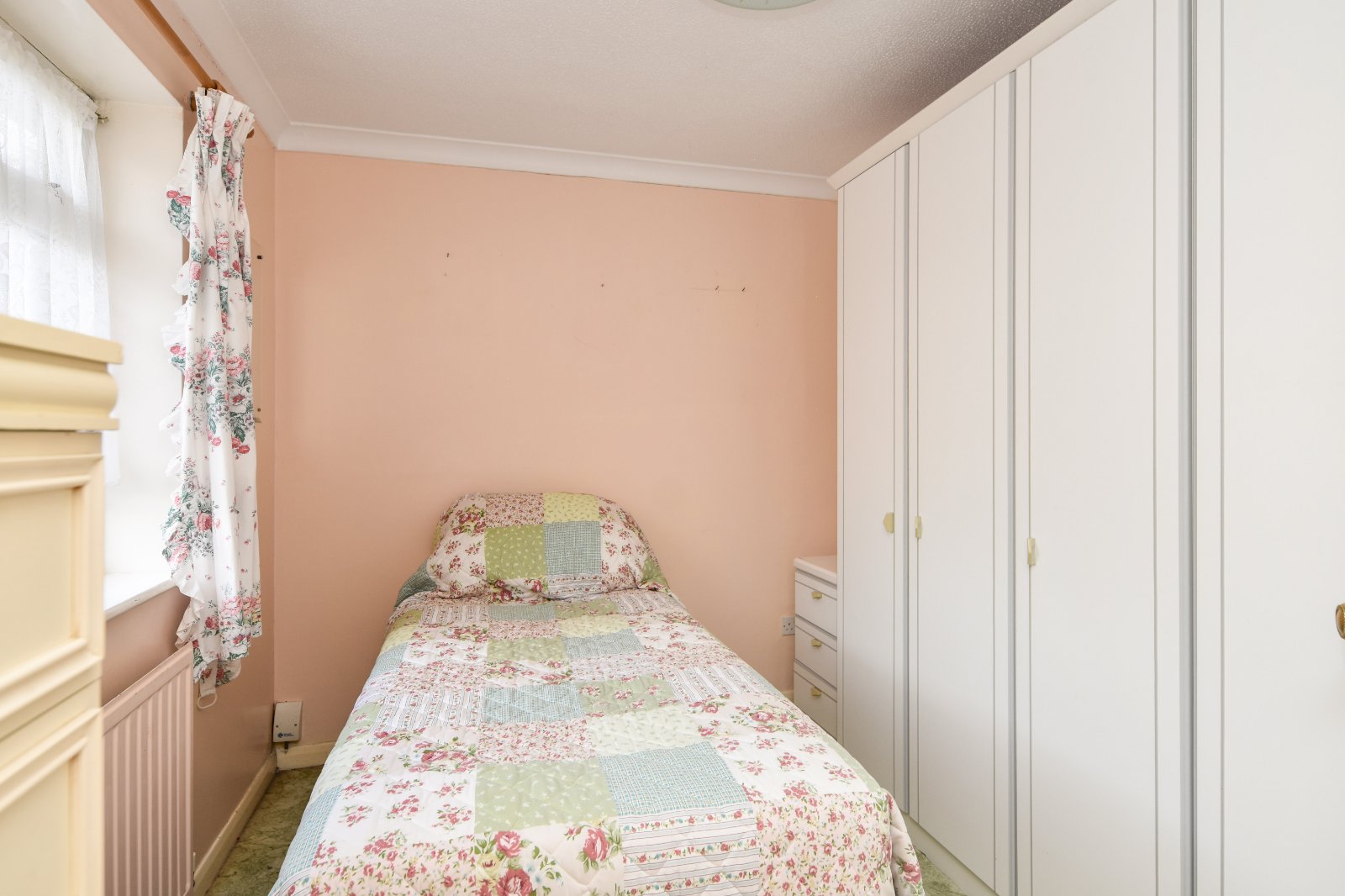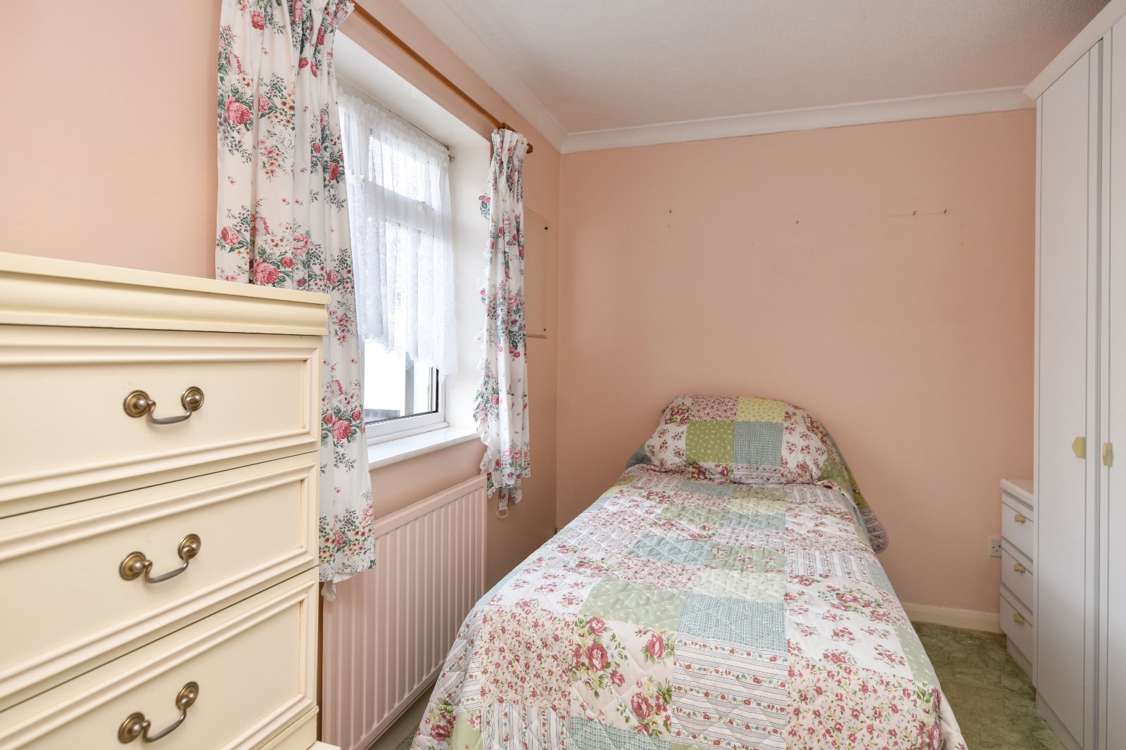uPVC double glazed window to front with views across large front garden area and the greensward beyond. overlooking rear Garden. Freestanding five door wardrobe with matching bedside cabinet (to remain). Radiator. Coving to textured ceiling.