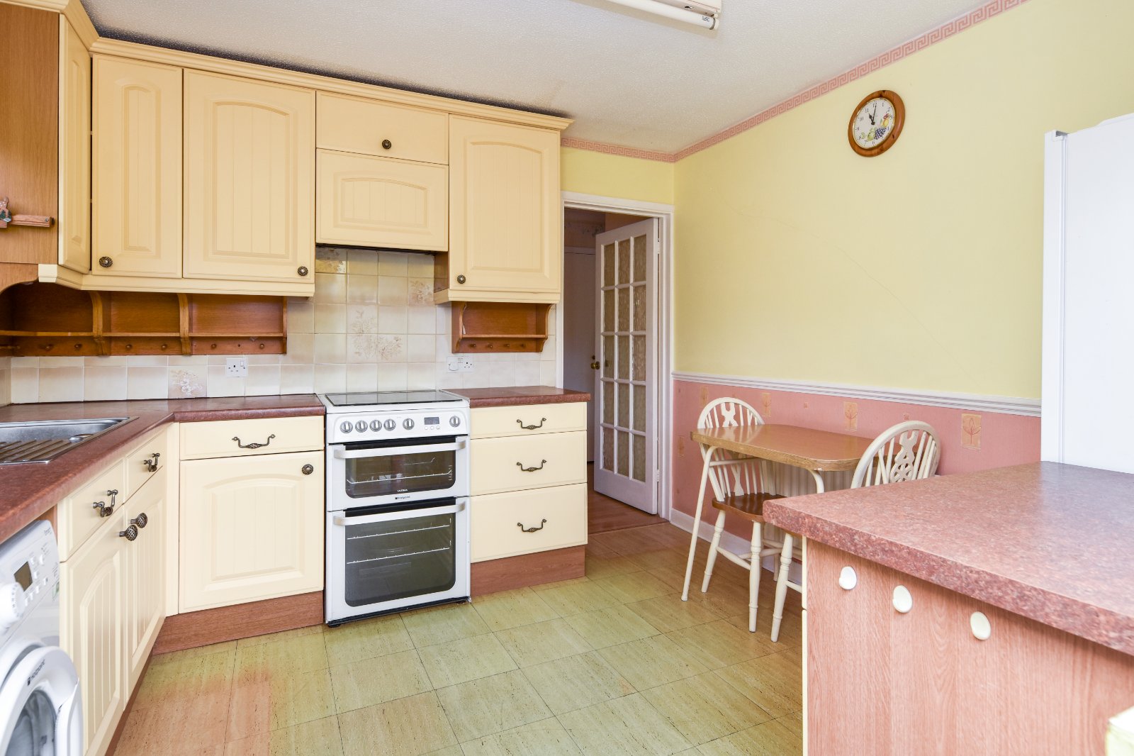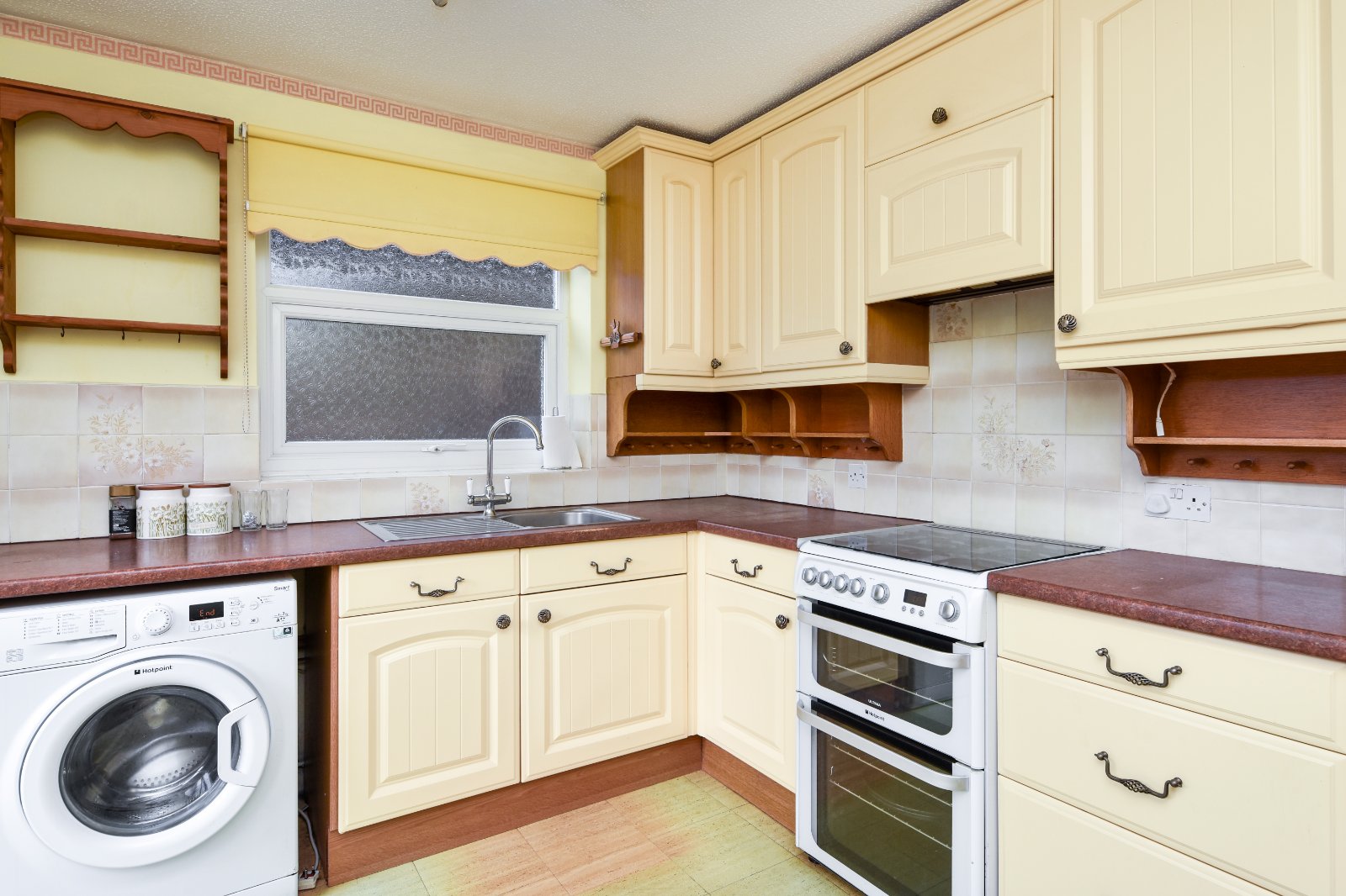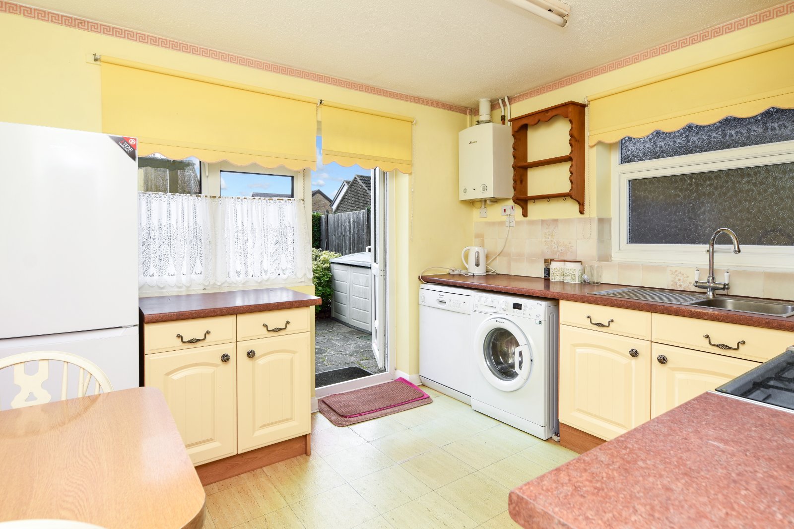 Obscure uPVC double glazed window to side aspect. Further window to rear with uPVC double glazed door providing access to rear Garden. The Kitchen is fitted with a range of eye and base level units with rolled edge working surfaces over inset with stainless steel single drainer sink unit with mixer tap over. Under counter 'Hotpoint' washing machine (to remain). Under counter dishwasher (to remain). Freestanding 'Hotpoint' oven with four ring gas hob over and concealed extractor canopy over. Space for upright fridge/freezer. Wall mounted Worcester boiler. Partly tiled. Dado rail. Radiator. Textured ceiling.