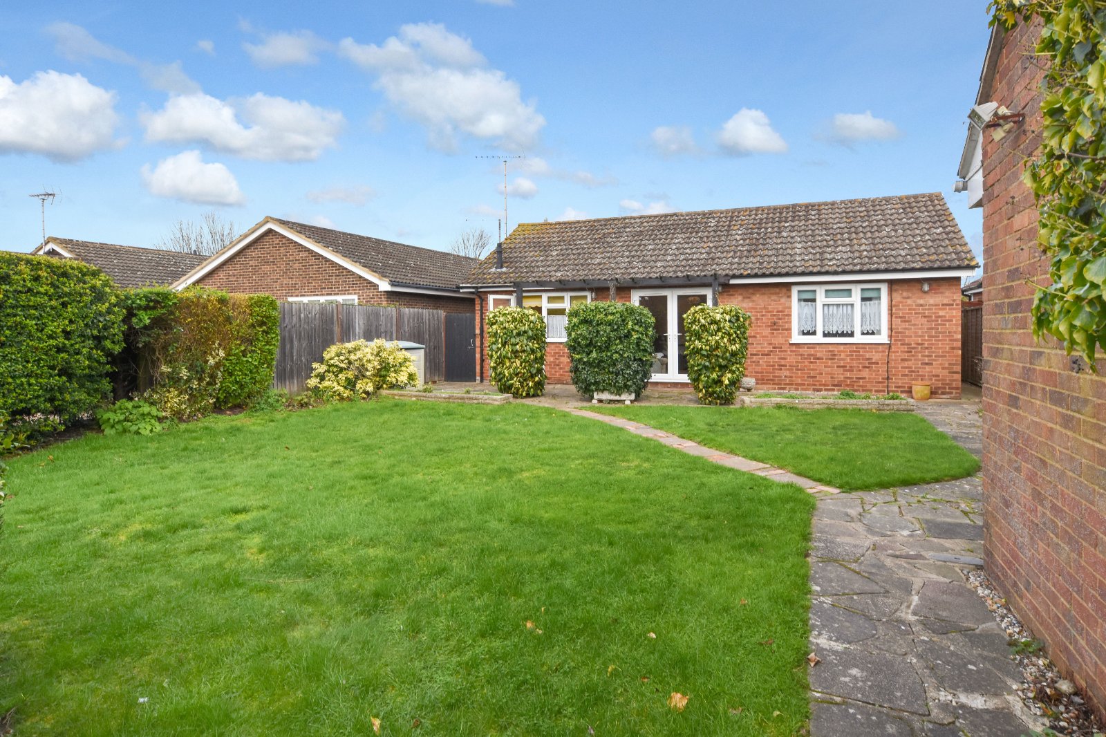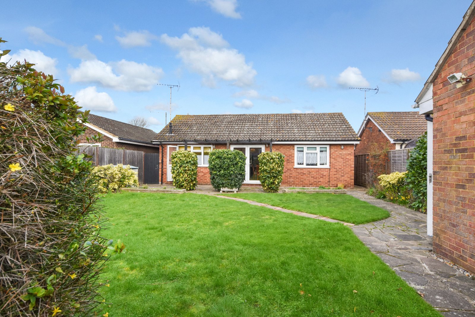 Situated on a generous plot is this DETACHED BUNGALOW which fronts onto a lovely open greensward. The Property has a large frontage and a generous SOUTH facing rear garden together with a detached GARAGE and ample off road PARKING to the rear of the home. The home has been well presented and offers versatile and spacious accommodation. Viewing is highly advisable. NO ONWARD CHAIN!