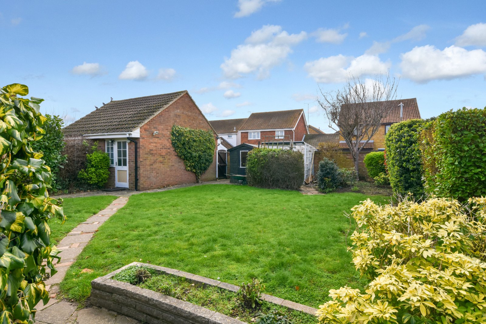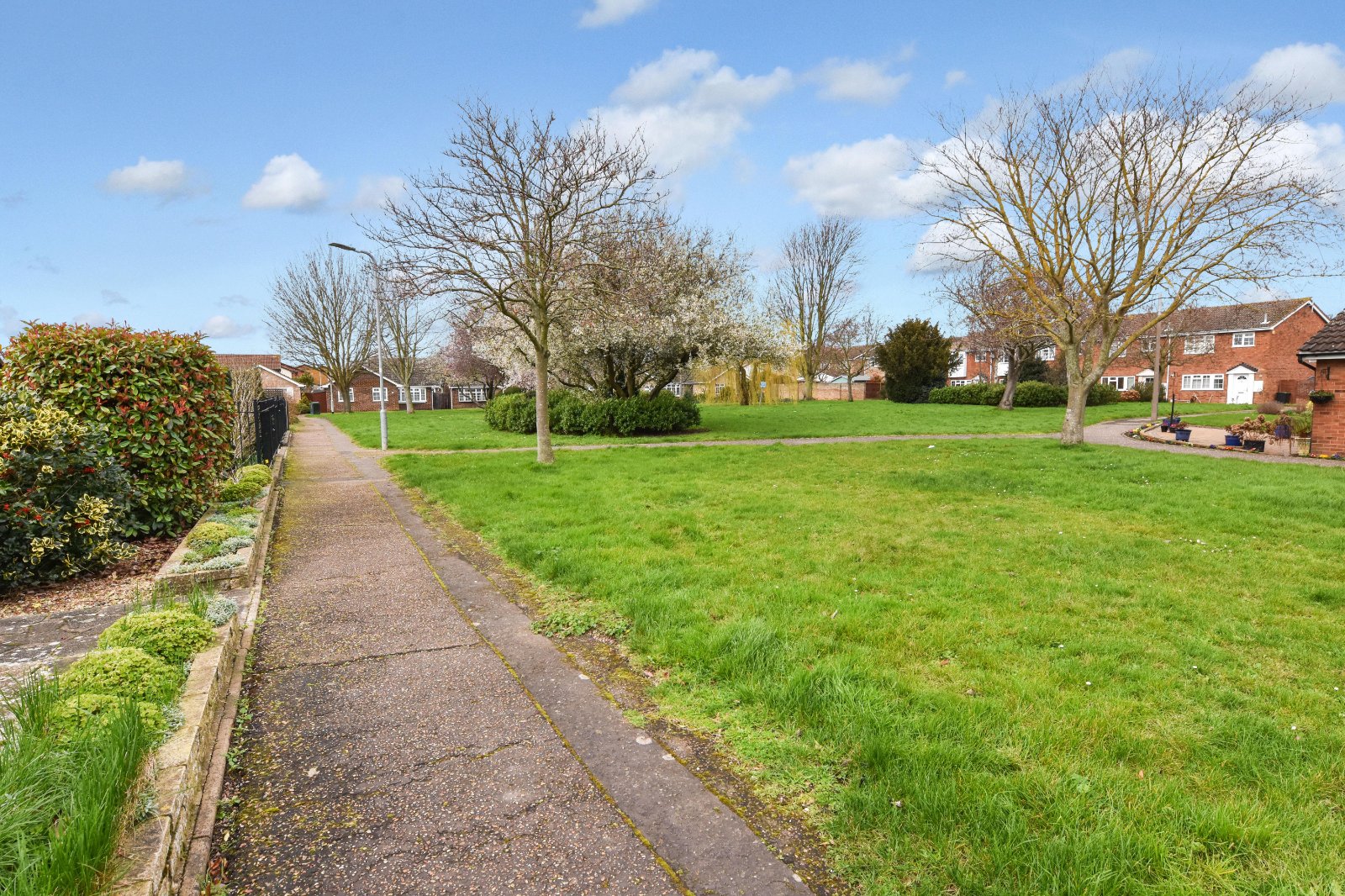 The property is located within a walkway position with open greensward. The front Garden is of a very generous size with a pathway leads to the front door with a variety of flower bed borders inset with various established shrubs.