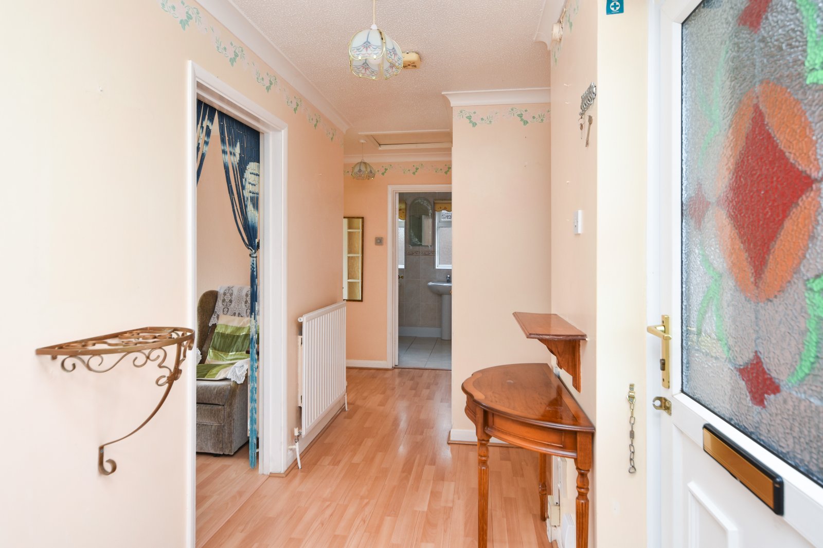 Doors all rooms. Door to airing cupboard with linen shelving. Further door to storage cupboard with shelving and hanging space. Thermostat control panel. Laminate wood effect flooring. Radiator. Textured ceiling with access to loft space.