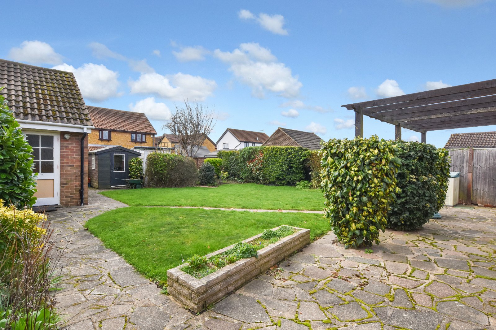 The SOUTH FACING garden measures approximately 55ft in depth and is accessed via the Kitchen and Dining Room and commences with a generous size patio seating area with attractive timber pergola to one section. Gated side access to both sides of the property. Outside water tap. The reminder of the garden is mainly laid to lawn with pathway leading to the rear gated access and Garage. To the rear of the Garden there is a greenhouse and timber framed shed (to remain). Variety of flower bed borders inset with various established shrubs. Fencing to side boundaries with brick retaining wall to the rear.