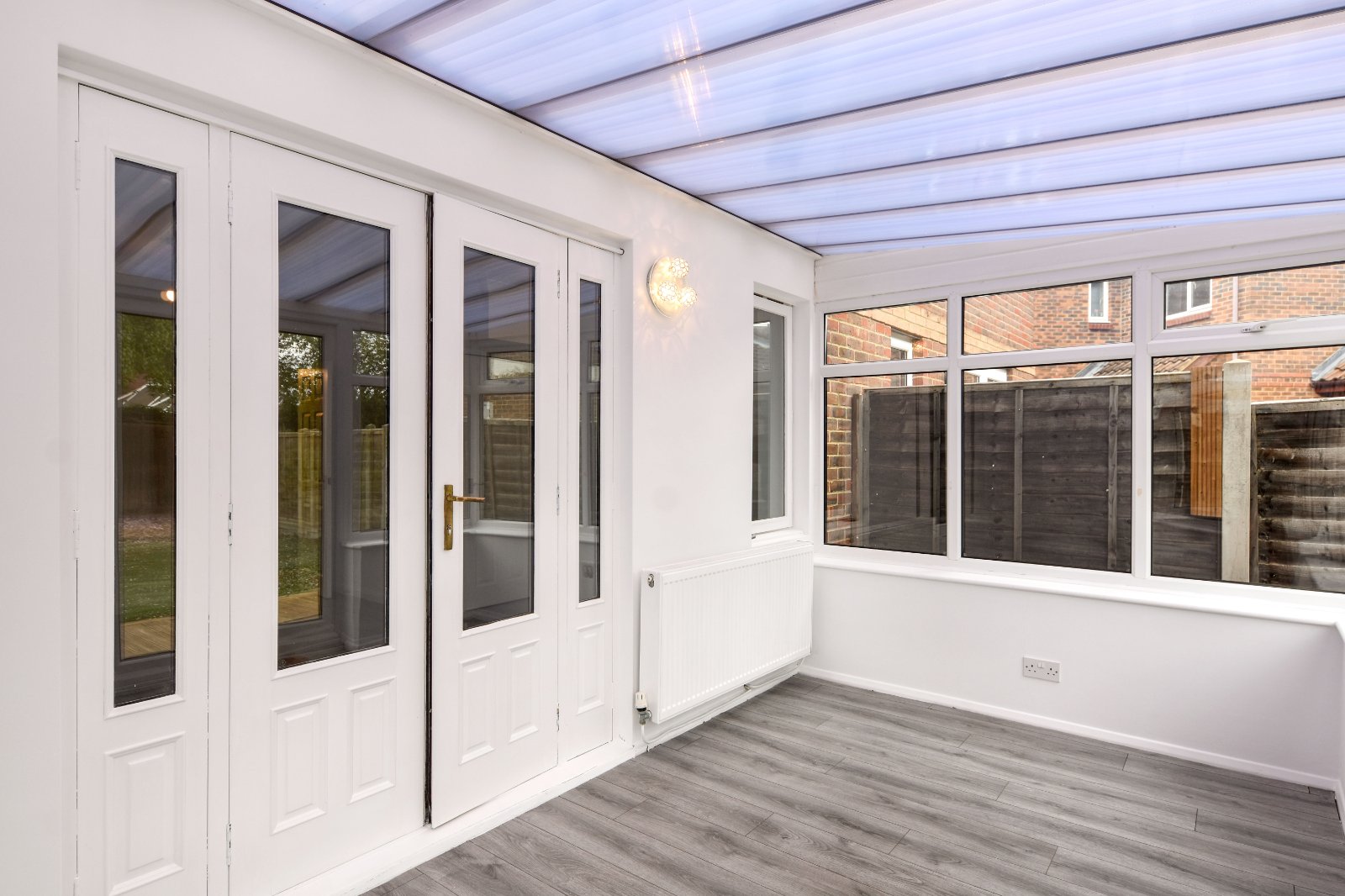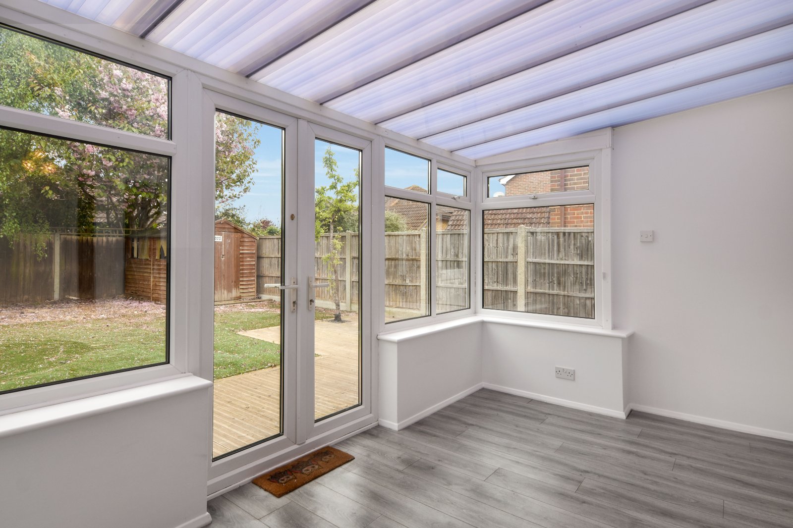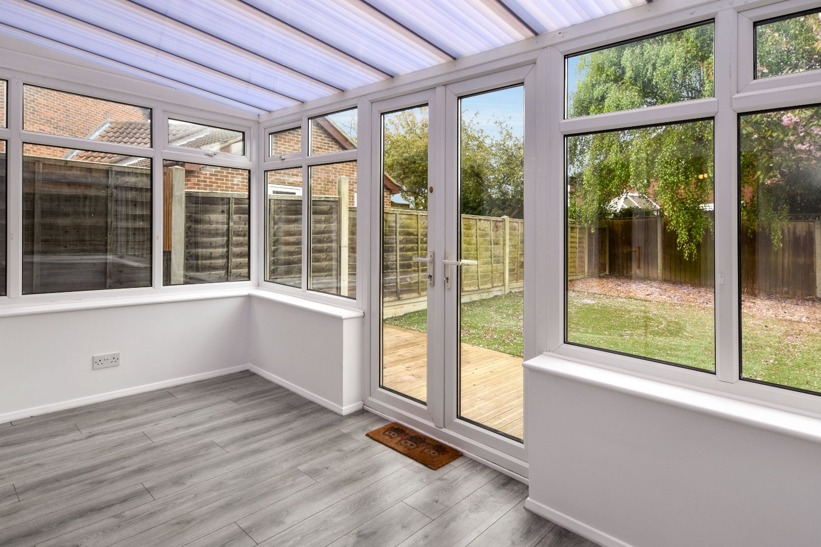 uPVC double glazed windows to side and rear aspects with a pair of uPVC double glazed french doors opening onto the rear Garden. Wall light point. Laminate wood effect flooring. Radiator. Polycarbonate roofline.