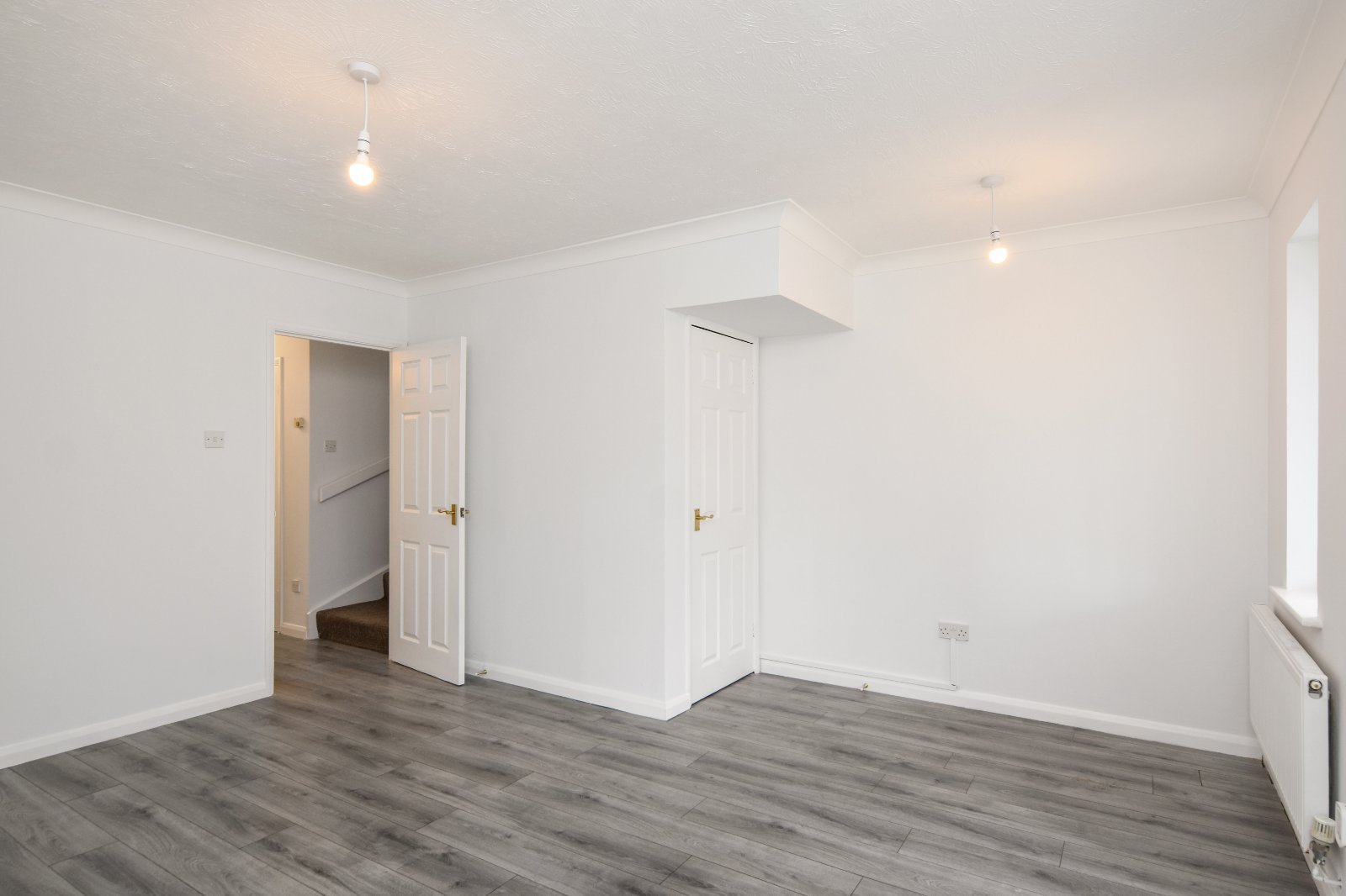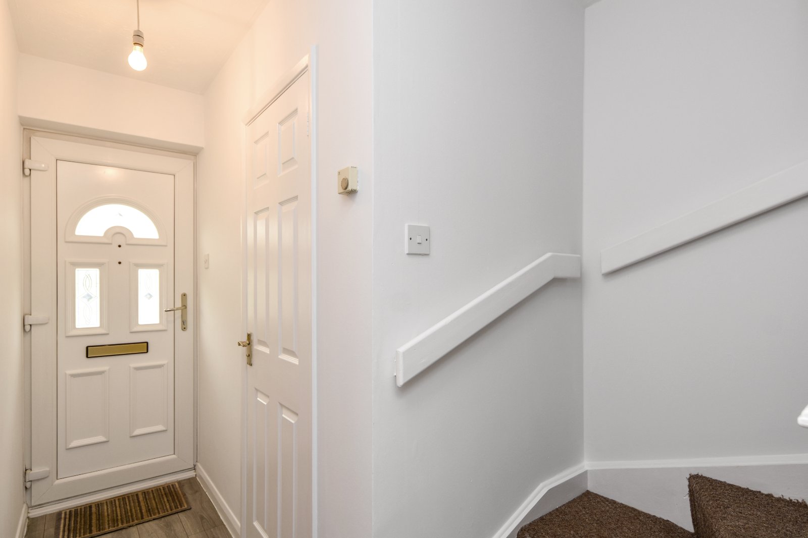Stairs rising to first floor accommodation. Panelled doors to Kitchen and Living Room. Thermostat control panel. Laminate wood effect flooring. Radiator. Textured ceiling. Further panelled door to;