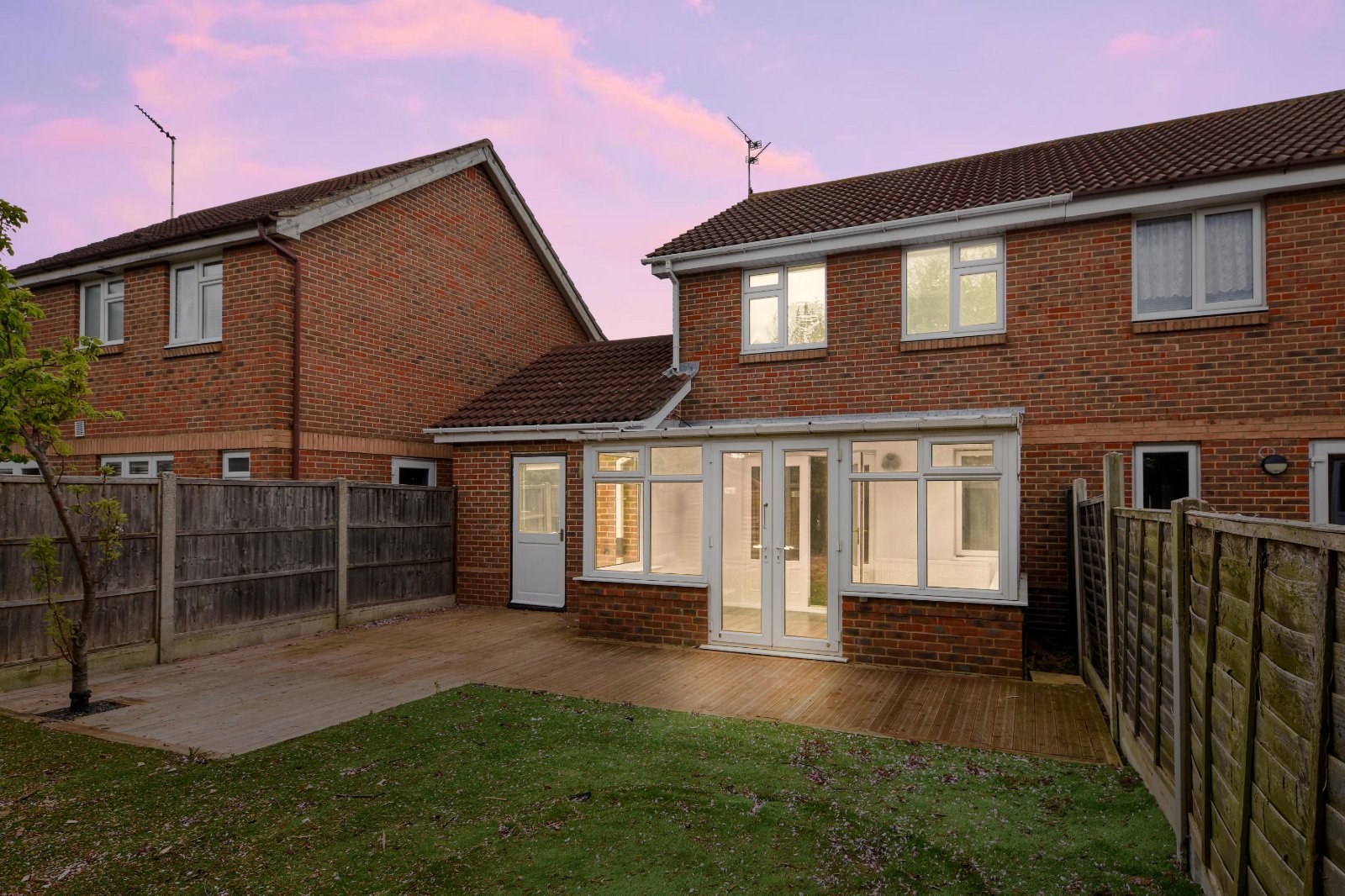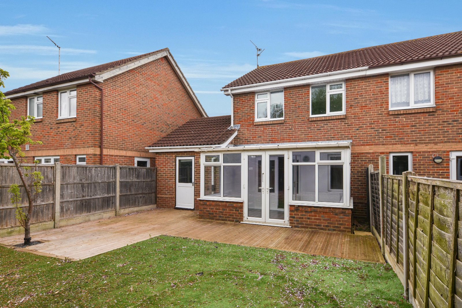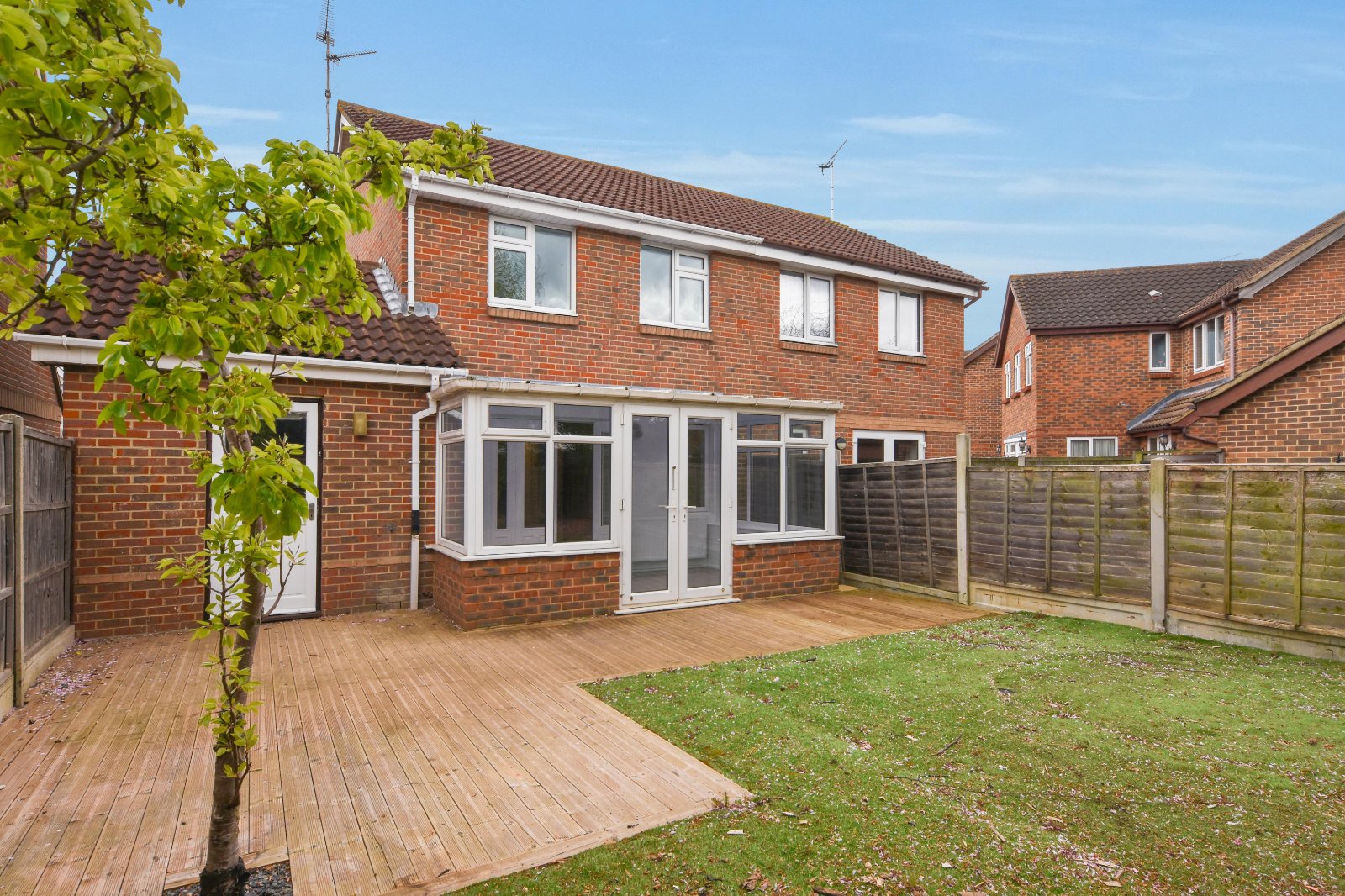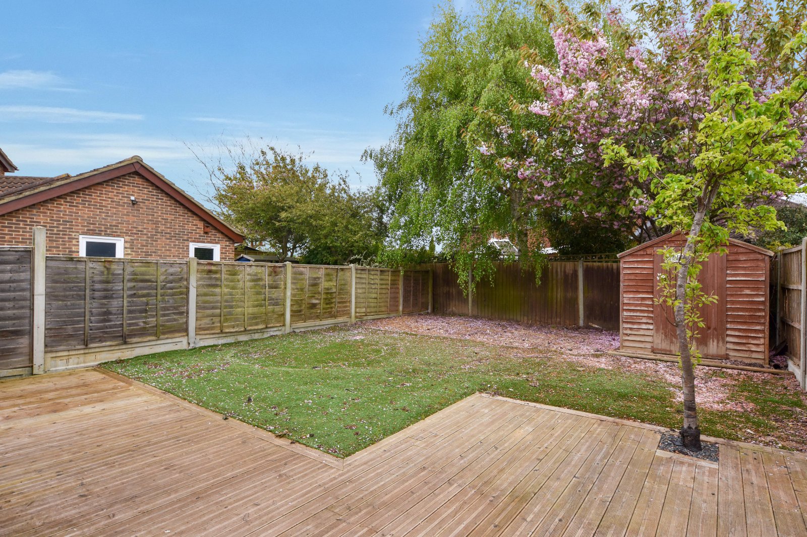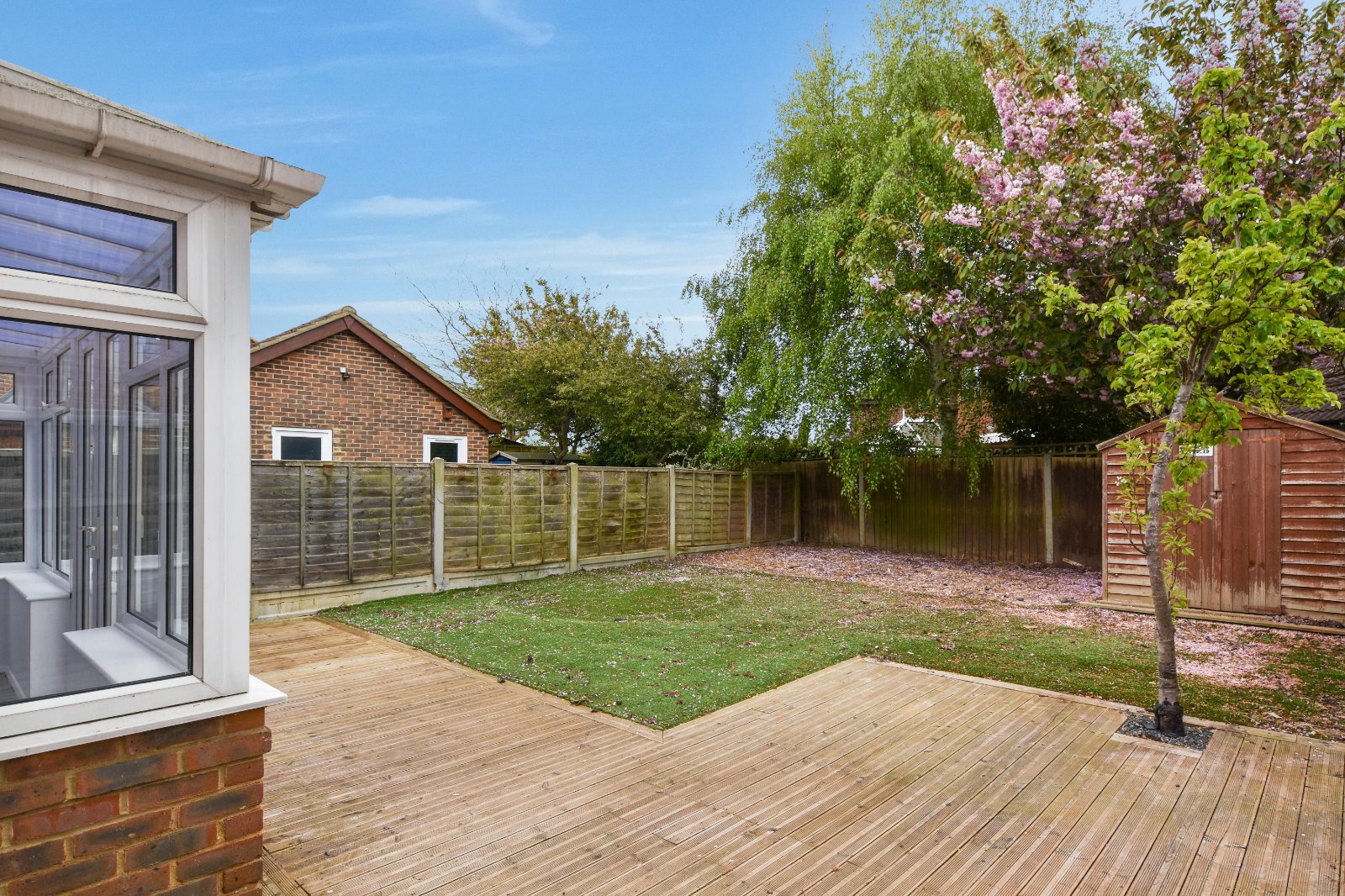 The SOUTH facing rear garden is approached via the Conservatory and commences with a decked pathway area extending to provide a patio seating area. Outside water tap. Fencing to all boundaries. Timber framed shed (to remain).