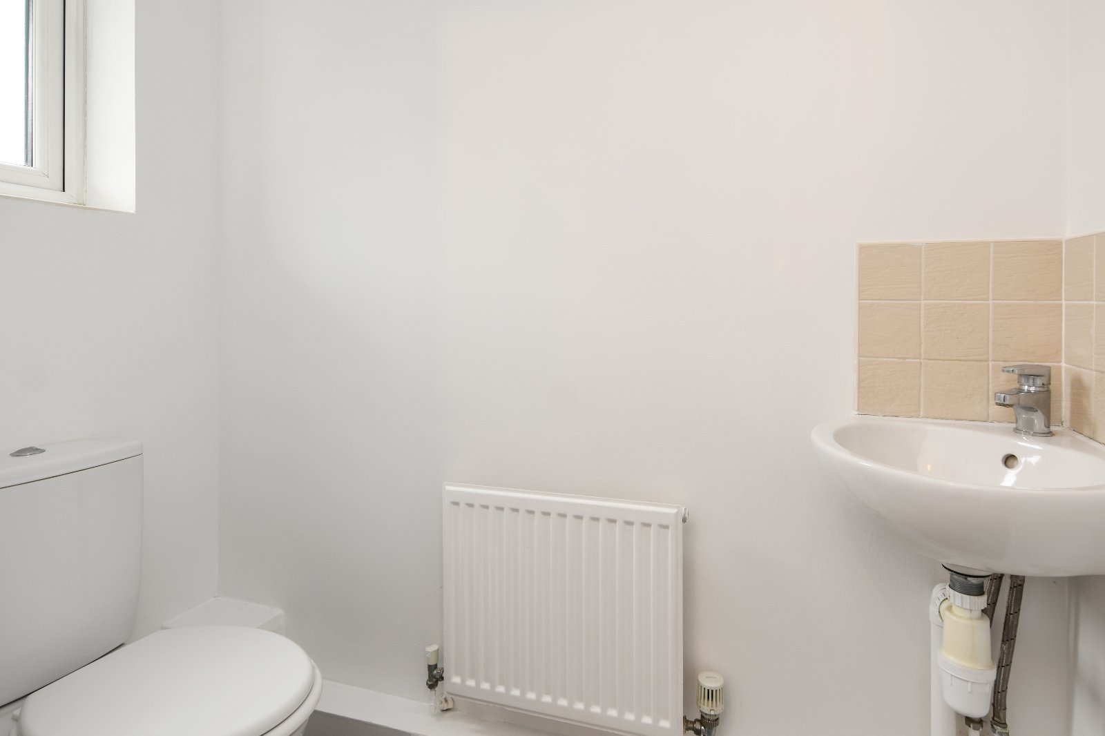 Obscure uPVC double glazed window to front aspect. The white two piece suite comprises corner wash hand basin with mixer tap and splashback tiling and dual flush WC. Laminate wood effect flooring. Radiator. Textured ceiling.