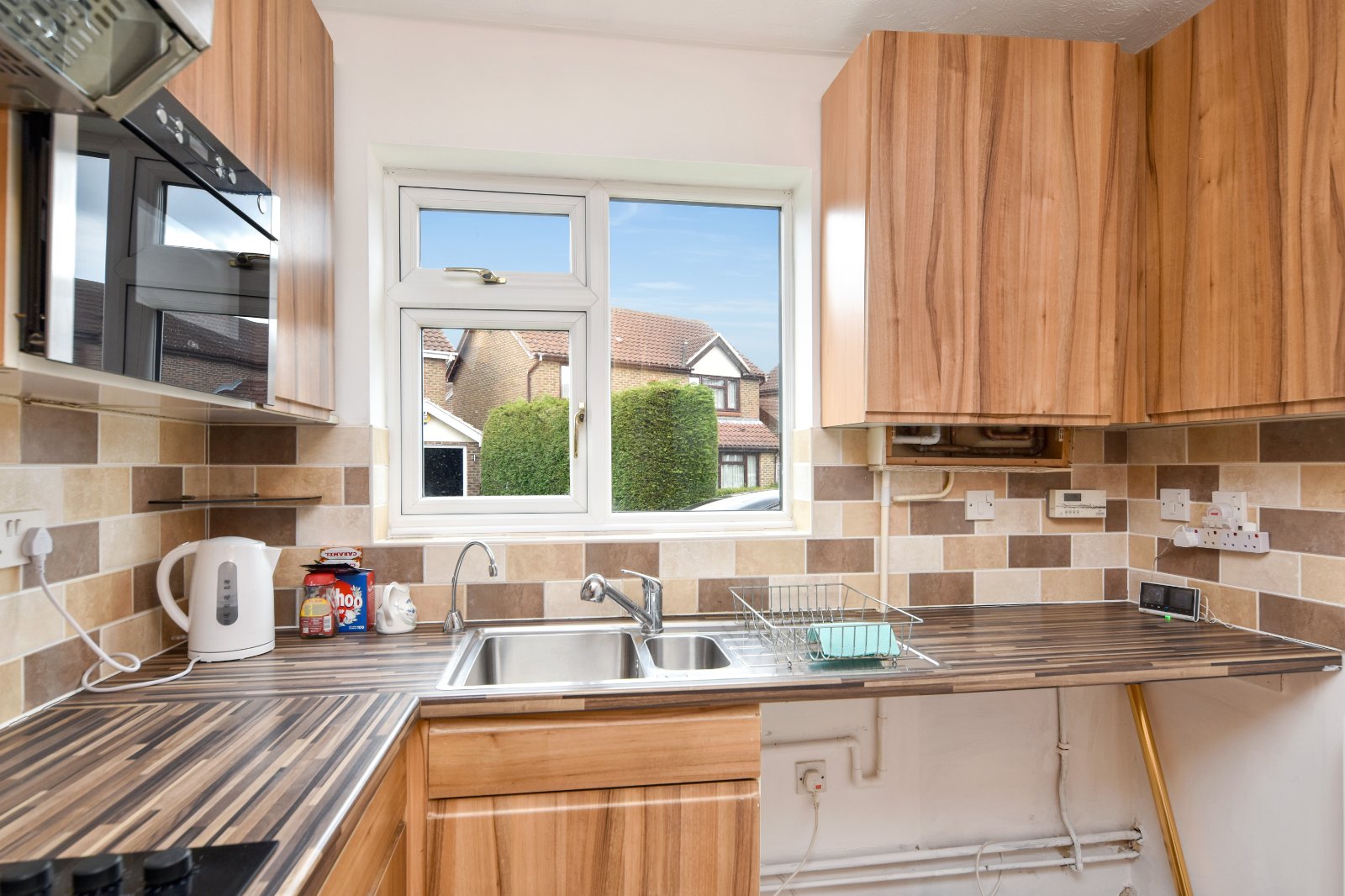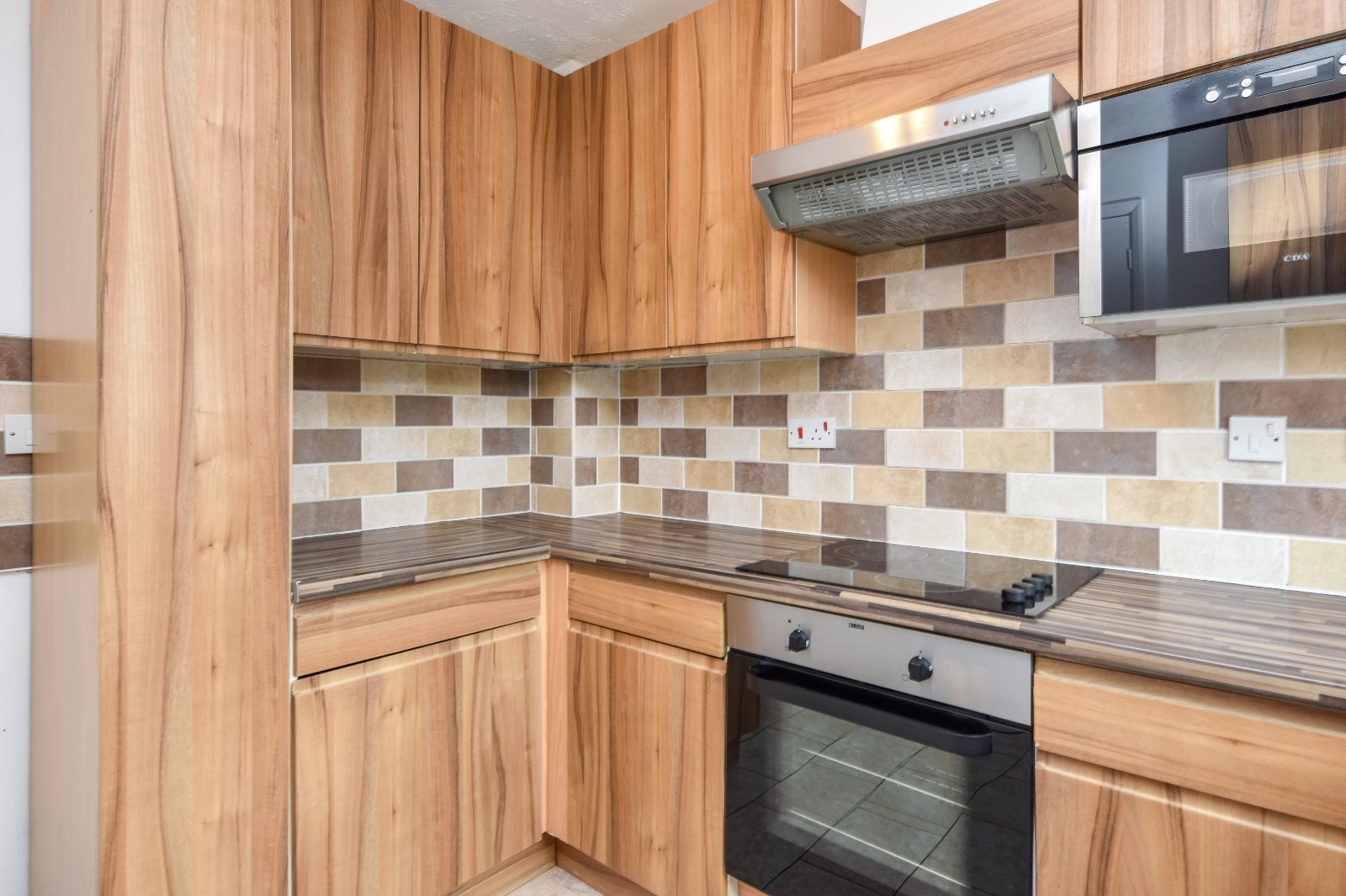 uPVC double glazed window to front aspect. The Kitchen is fitted with a range of eye and base level units with wood effect working surfaces over inset with one-and-a-quarter stainless steel single drainer sink unit with mixer tap over. Under counter recess for appliances. Further space for upright fridge/freezer. Built in 'Zanussi' electric oven with four ring 'Hotpoint' electric hob over with extractor canopy above. Built in 'CDA' eye level microwave. Concealed recently installed wall mounted boiler (Logic System2). Splashback tiling. High gloss ceramic tiled flooring. Radiator. Textured ceiling.