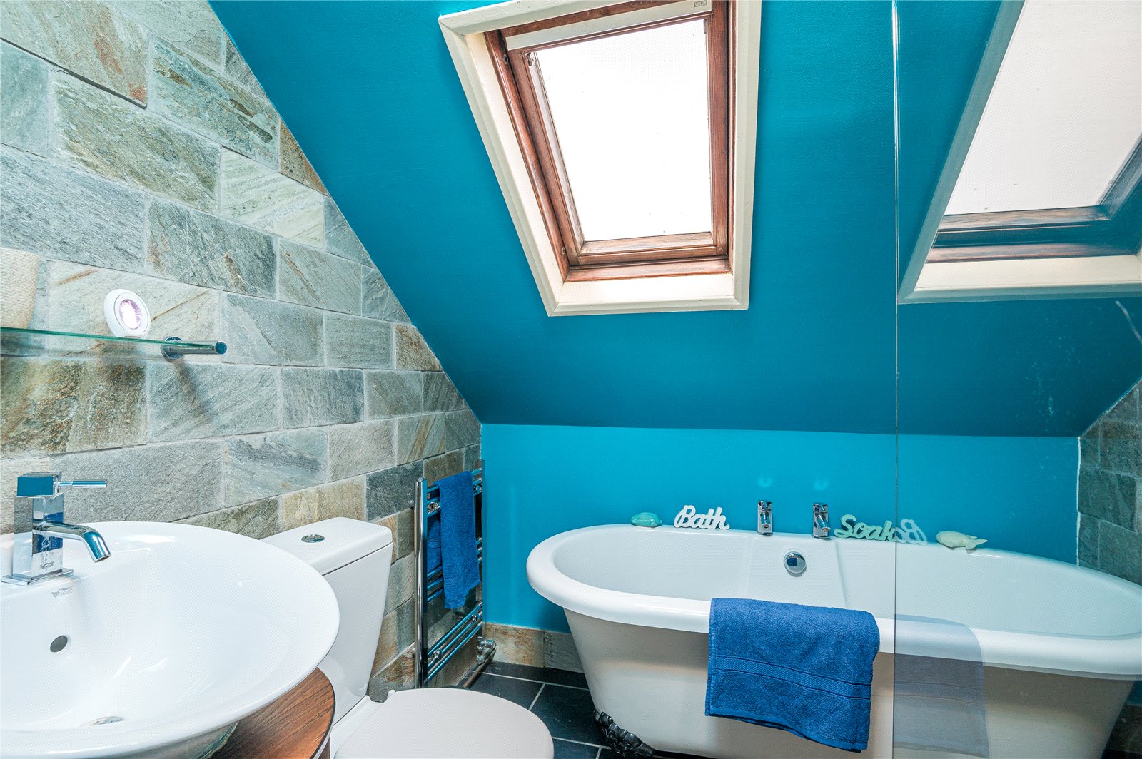 Twin double glazed Velux style windows to side. Fitted with a four piece suite comprising of clawfoot rolled-edged freestanding bath, dual flush close coupled WC, frameless glass shower enclosure with rainwater and handheld shower fittings, and bespoke designer vanity wash handbasin on polished wooden stand with display shelving. Slate effect porcelain tiled floor. Slate tiled walls. Smooth plastered part-vaulted ceiling. Electric shaver point. Recessed LED lighting. Drop light switch.