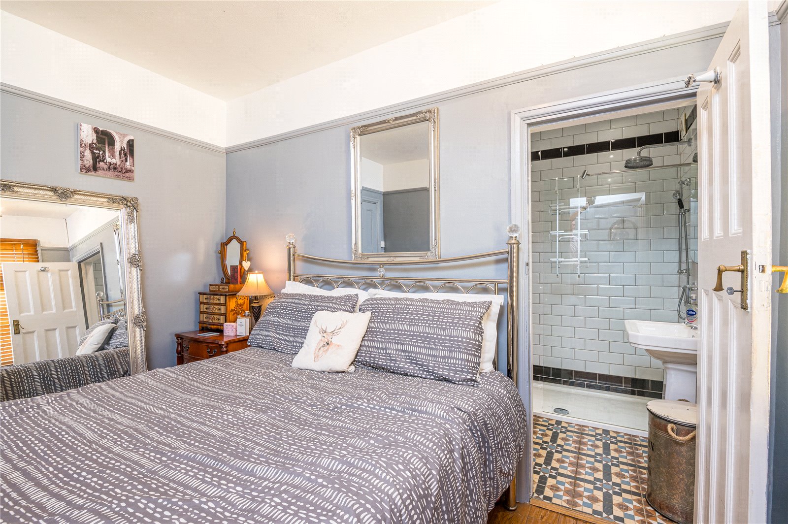 A Victoriana style luxury ensuite with frameless glass walk-in shower with handheld and rainwater shower fittings, high-flush WC, regency style pedestal wash handbasin, and old-school radiator style heated towel rail. Metro tiling to all walls with feature border tiles, and Victoriana mosaic effect tiling to floor. Extractor fan. Smooth plastered ceiling with recessed LED lighting. Drop light switch.