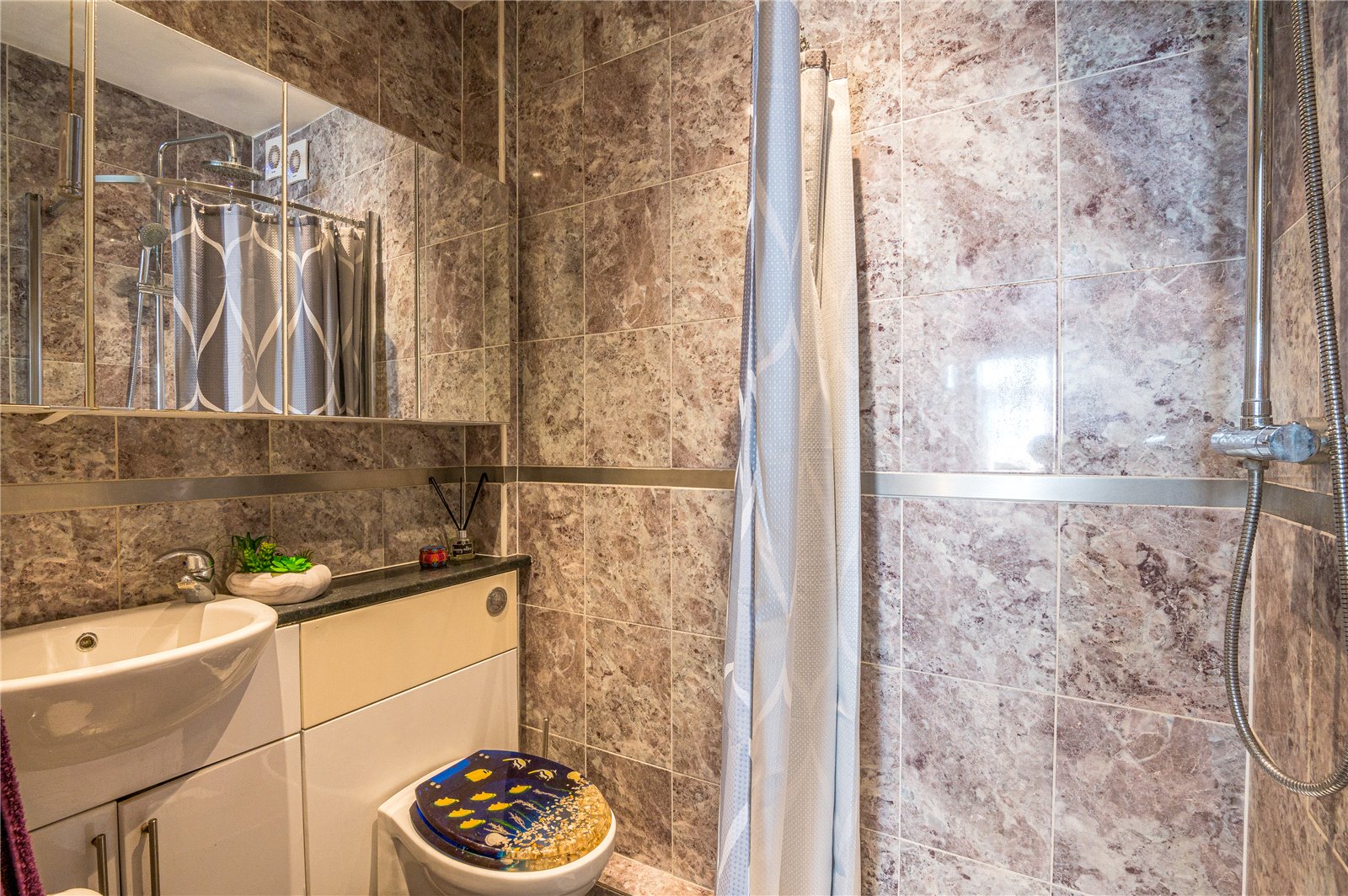 A fully tiled room has a corner offset quadrant shower tray with rainwater and handheld shower fittings, and fitted bathroom furniture comprising integrated dual flush WC and vanity wash handbasin with storage cabinet beneath. Heated towel rail. Full porcelain tiling to all walls with feature brushed steel border. Slate effect porcelain tiled floor. Extractor fan. Smooth plastered ceiling with recessed LED lighting. Drop light switch.