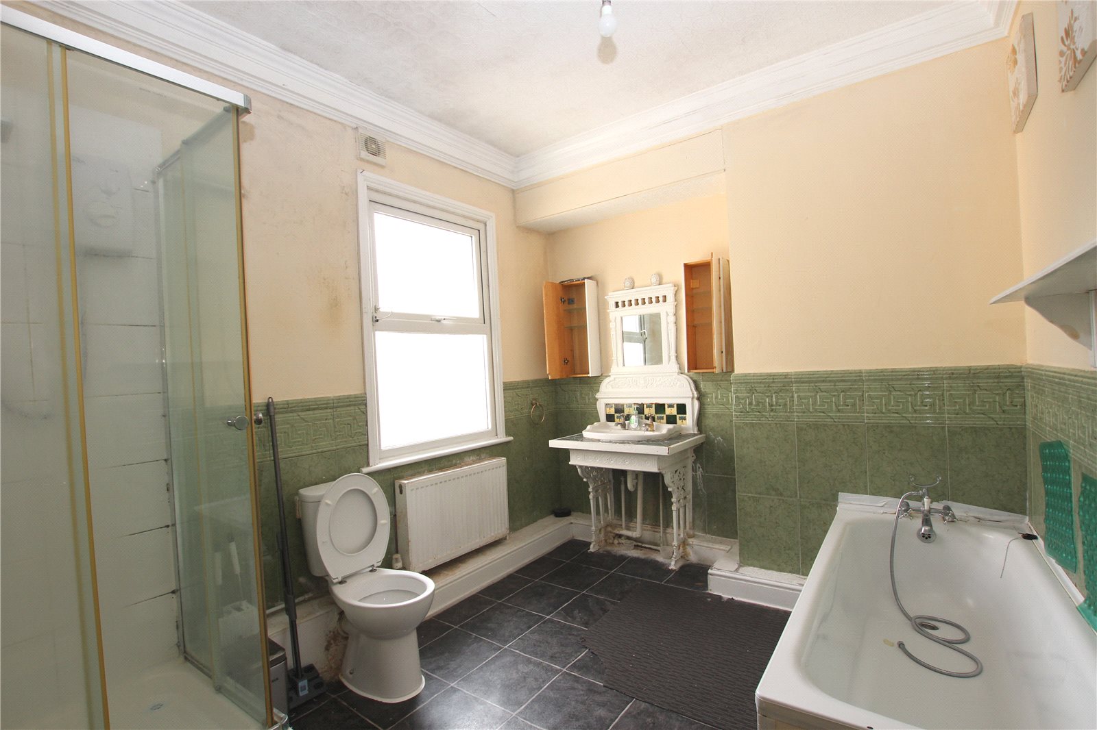 UPVC double glazed obscured window to rear. Bathroom is fitted with a four piece suite, comprising low flush wc, countertop wash hand basin with fitted vanity mirror. Panelled bath with mixer tap and separate overhead shower attachment. Enclosed shower cubicle with wall mounted electric shower, adjustable head. Wall mounted radiator. Tiled effect vinyl flooring. Part tiled walls. Coved cornice to anaglyptic ceiling with feature ceiling rose.