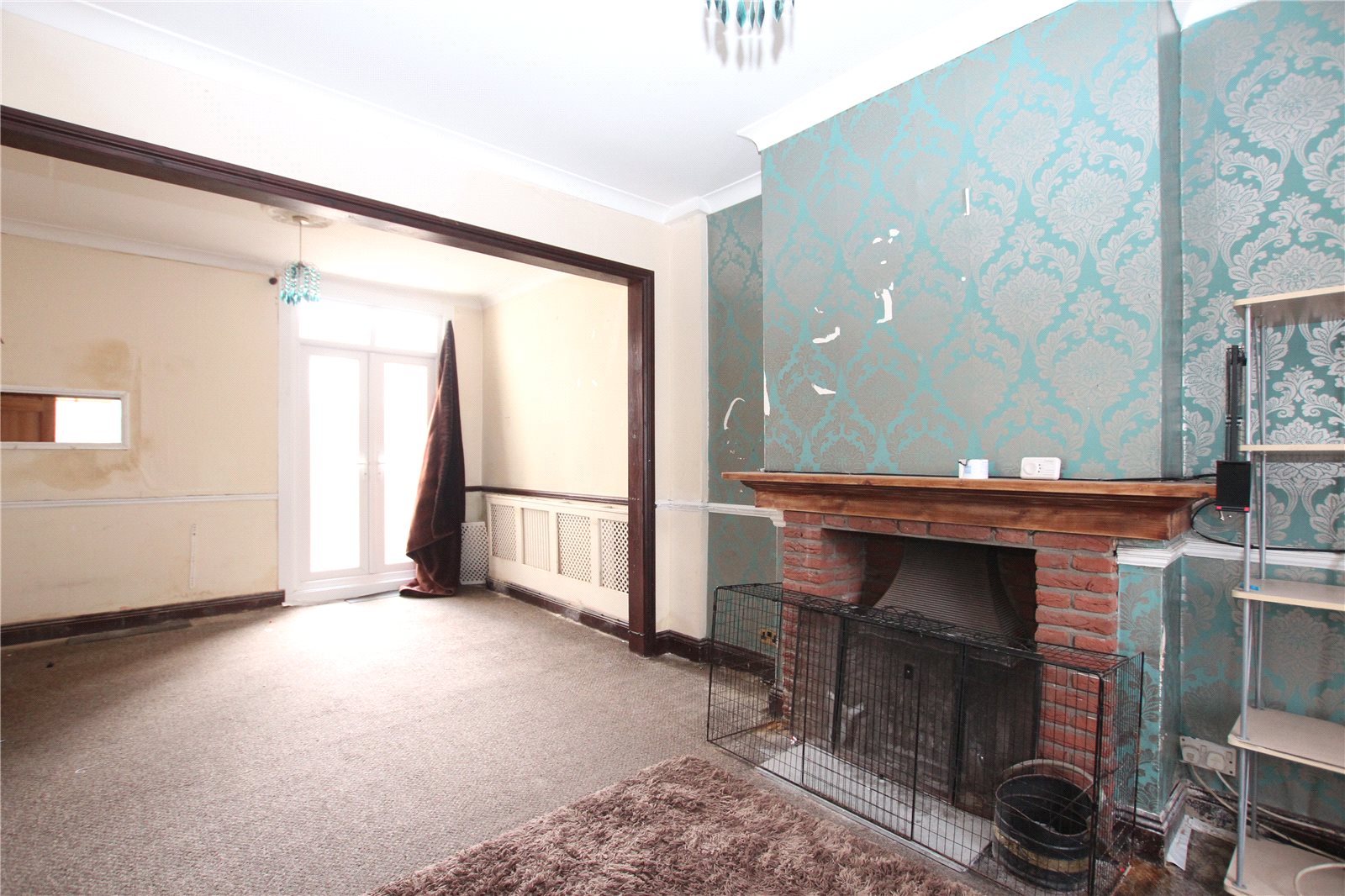 Into bay. Large UPVC double glazed window unit to front. Double glazed French doors to rear leading on to rear garden. Wall mounted radiator. Feature fireplace with open fire. Brick surround. Tiled hearth. Wooden mantle. High level skirting. Feature dado rail. Decorative wall panelling. Coved cornice to smooth plastered ceiling with feature ceiling rose.