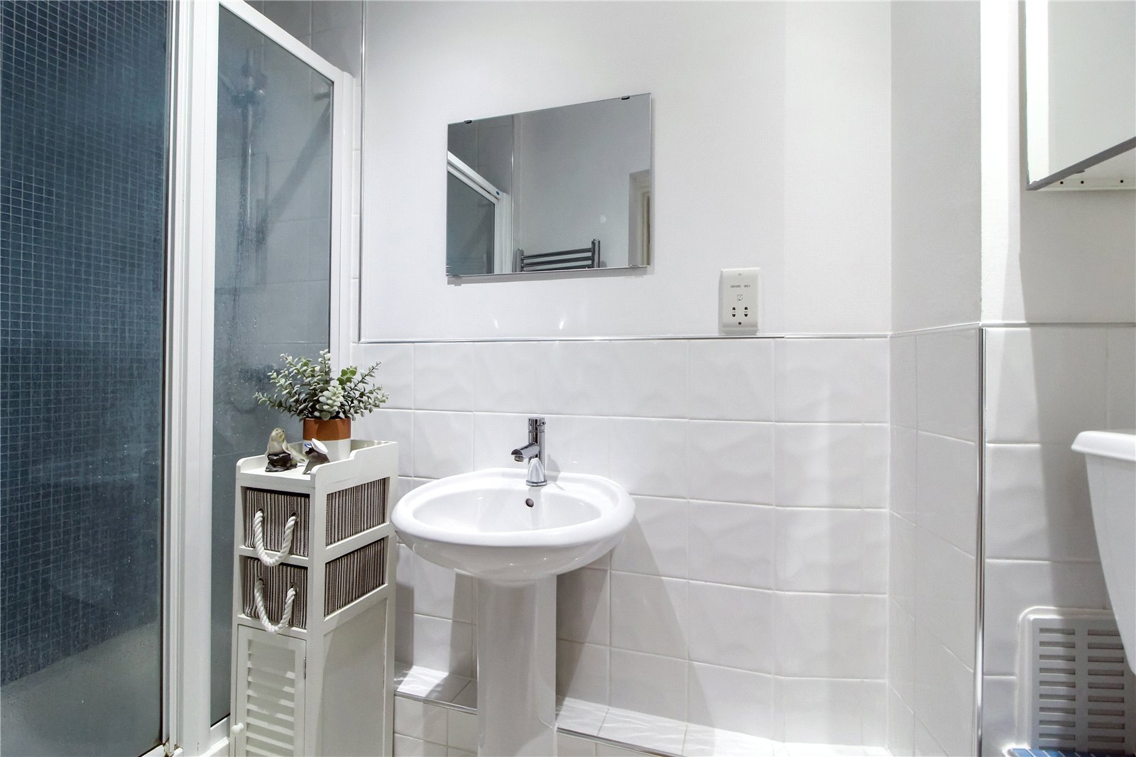 Three-piece modern bathroom comprising of low level wc, enamel hand wash basin with chrome mixer tap, walk-in shower cubicle with chrome attachment and wall mounted heated towel rail. Tiles to floor and partially tiled walls with smooth plaster finished. Smooth plastered ceiling, completed with fitted spotlights.